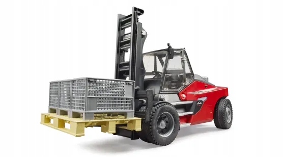 В комплект входит поддон большой вместимости и три контейнера на поддонах, что позволяет разыгрывать реалистичные сцены транспортировки. Модель подходит для других транспортных средств BRUDER, таких как строительный грузовик Mercedes Benz (артикул BR-03551 не входит в комплект) и уменьшенная модель вилочного погрузчика Linde H30D (артикул BR-02511 не входит в комплект).