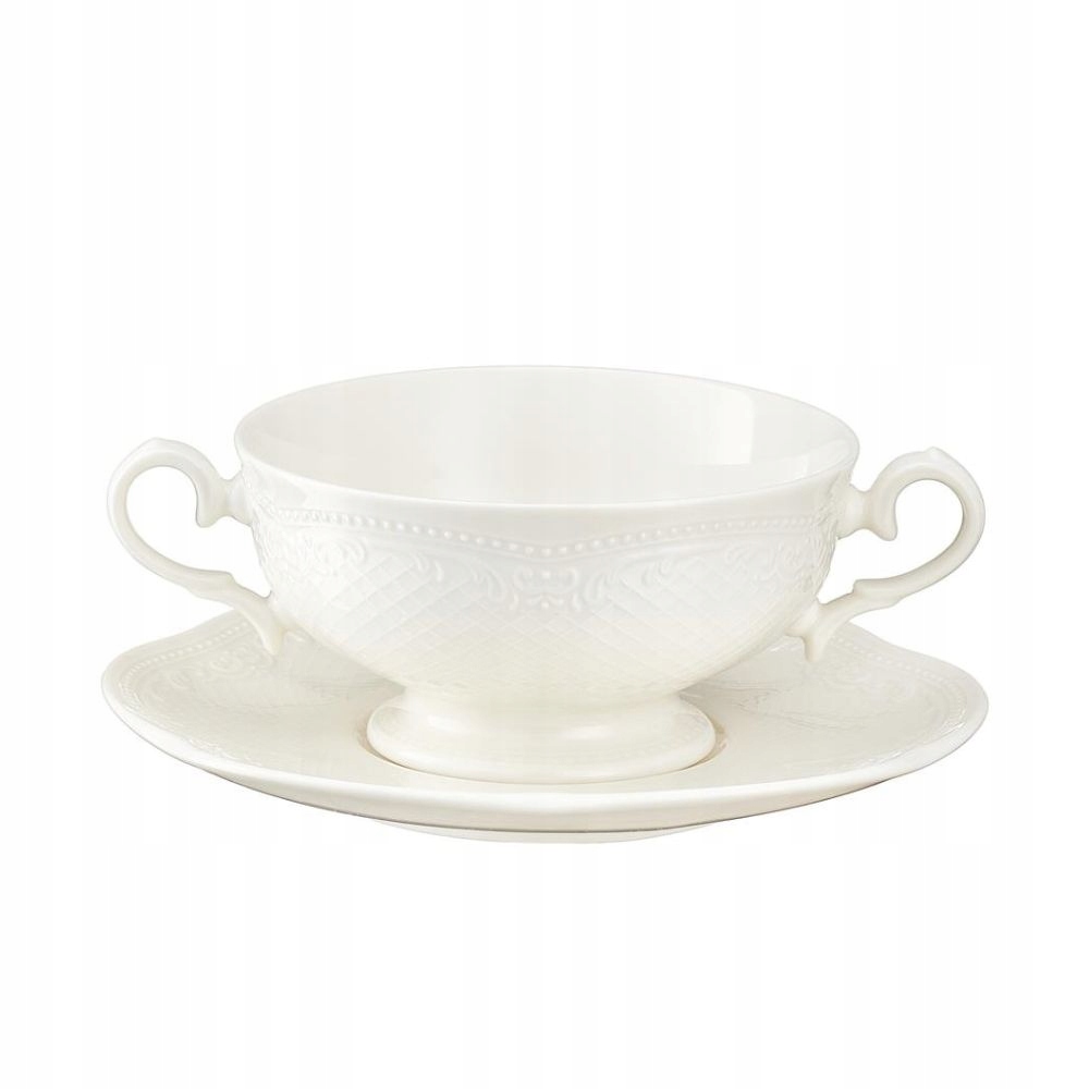 Элегантная слитка с ушами и соответствующая тарелка из коллекции Niobe - это классический элемент посуды, идеально подходящий для семейных праздников, праздников и элегантных вечеринок. Разработанный для подачи прозрачных супов, таких как бульон или боршт, он также работает для овощных кремов.