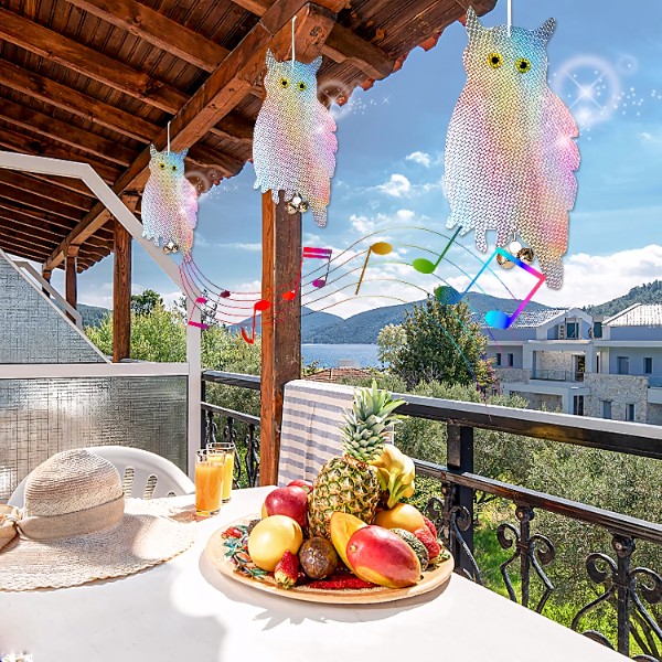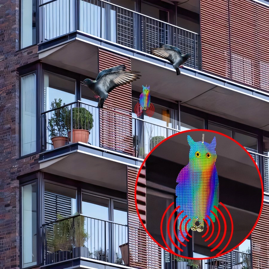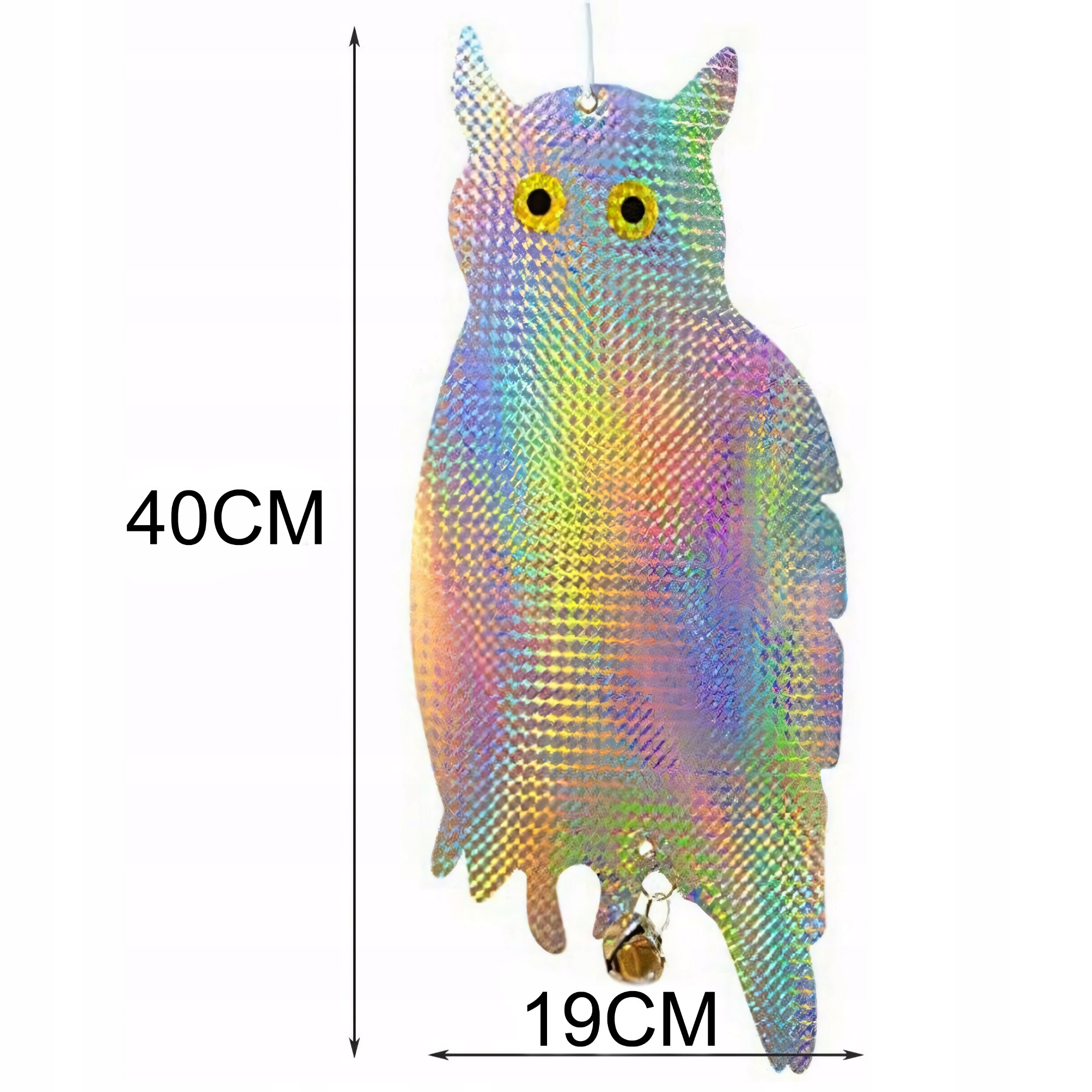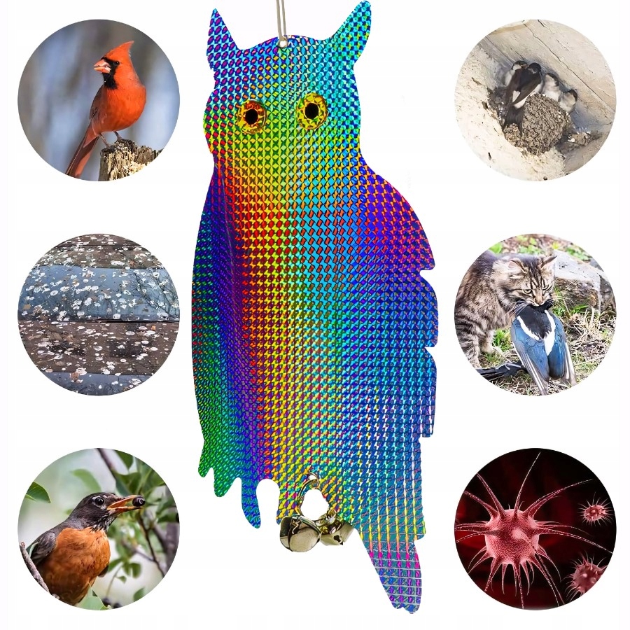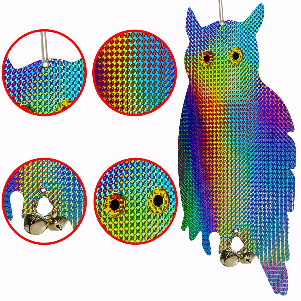 Голографическая сова оснащена двумя колокольчиками, которые издают на ветру звуки, отпугивающие птиц, что эффективно повышает защиту.