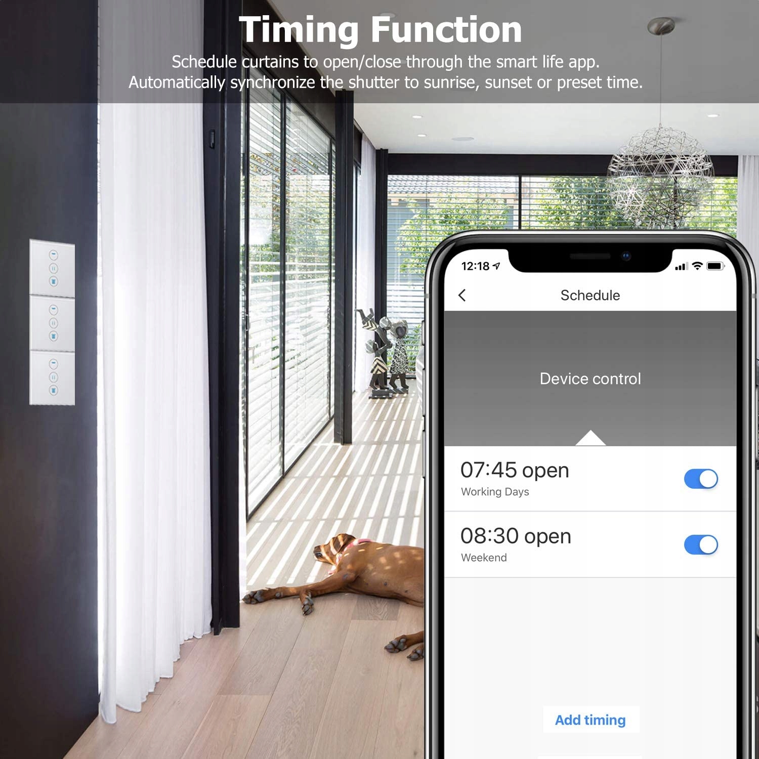 Функция гибкого расписания: создайте один или несколько раз для рулонной шторы с помощью смартфона и запланируйте автоматическое открытие или закрытие устройства в другое время. Расписание также можно повторять каждый день или в определенные дни недели.