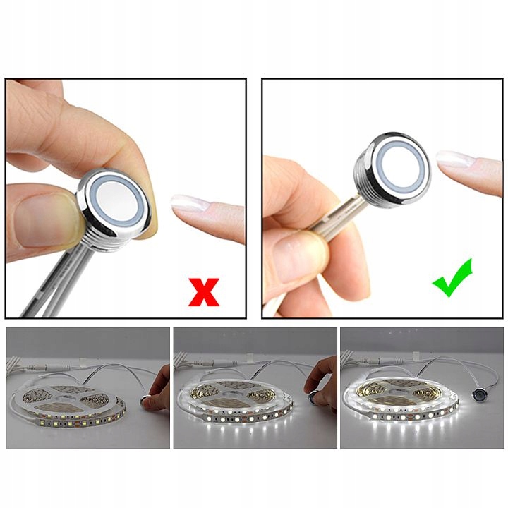Включение и выключение осуществляется прикосновением к пружине, расположенной на датчике. Перемещение пружины включает или выключает светодиодную ленту. Существенным удобством является светодиод, указывающий положение выключателя в профиле под установленным абажуром. Устройство вписывается в любой профиль шириной 10 мм. Удерживание переключателя приводит к плавному свечению и затемнению светодиодной ленты.