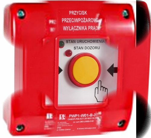 Ручная кнопка предназначена для активации «Пожарного выключателя», который отключит электропитание здания от источника электроэнергии в случае возникновения пожара во время спасательной операции. В пожарных зонах объемом более 1000 м³ или содержащих взрывоопасные зоны следует применять противопожарный выключатель, отключающий электропитание всех цепей, за исключением цепей, питающих установку и устройств, работа которых необходима при пожаре. Автомат противопожарной защиты должен располагаться вблизи главного входа на объект или разъема и иметь соответствующую маркировку. Отключение электропитания пожарным выключателем не может привести к автоматическому включению второго источника электроэнергии, в том числе генераторной установки. Исключением являются источники питания электроприборов, которые должны функционировать во время пожара.Кнопку ручного привода ПРМ1 можно использовать в качестве «Пожарного выключателя питания» при условии размещения над ней таблички: «Пожарный выключатель питания». В комплект входит самоклеящаяся табличка: «Пожарный выключатель».Кнопка ручного пуска PWP1 с двойной светодиодной сигнализацией предоставляет информацию о: 1. Зеленый светодиод – статус запуска2. Красный диод – состояние контроля.Светодиоды завершаются соединительным блоком. Красный светодиод должен гореть при включении выключателя, при разбитии стекла красный светодиод должен погаснуть и загореться зеленый светодиод, что информирует об отключении электричества в здании. Питание зеленого светодиода должно осуществляться от отдельного источника питания, желательно перед выключателем.Минимальное количество проводов, необходимое для подключения выключателя: Исполнение выключателя с 2 светодиодами: 1. 2 светодиода + 3 контакта – минимум 6 проводов 2,2 светодиода + 2 контакта – минимум 5 проводов 3,2 светодиода + 1 контакт – минимум 4 провода Национальная техническая оценка CNBOP-PIB – № CNBOP-PIB-KOT-2019 /0110-1014 издание 2 Национальный сертификат постоянства характеристик № 063-UWB-0186