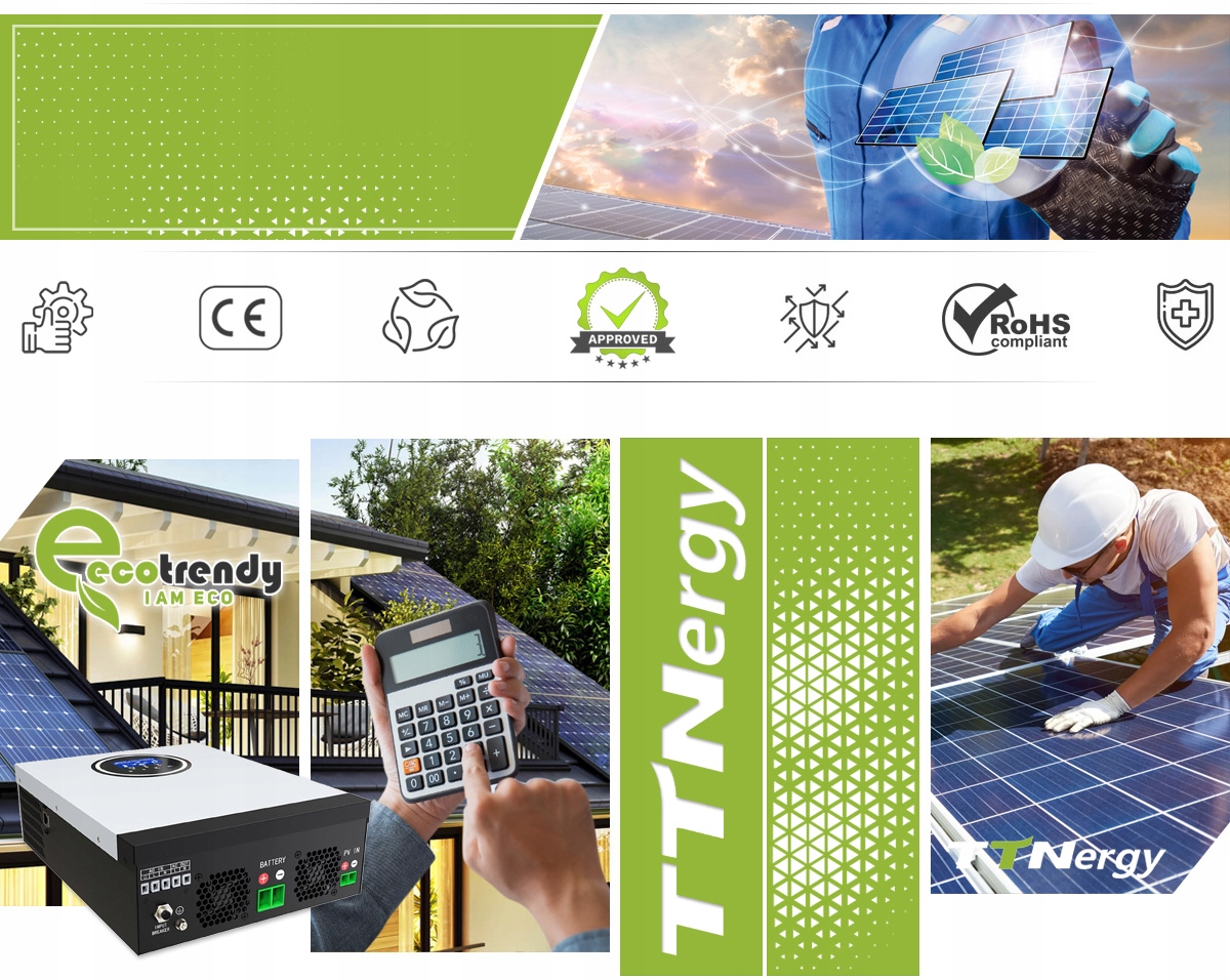 TTNERGY | МОЩНОСТЬ 3000Вт | МПРТ | ВНЕ СЕТИ | СОЛНЕЧНЫЙ ИНВЕРТОР Солнечный инвертор 3000 Вт PAL от TTNergy Европейский климатический закон включает обязательную климатическую цель ЕС: сокращение выбросов в ЕС как минимум на 55% к 2030 году. Страны ЕС работают над новыми правилами, которые помогут достичь этой цели и к 2050 году. сделать ЕС климатически нейтральным. Для достижения этой цели предназначен пакет «Готовность к 55» — это набор предложений, направленных на изменение и обновление правил и создание новых инициатив для обеспечения соответствия политики ЕС климатическим целям, согласованным Советом и Европейским парламентом. . ECOtrendy была создана в связи с этими заявлениями ЕС и высоким ростом цен на поставку электроэнергии, полученной из традиционных источников. Все, что угодно, чтобы противодействовать этой тенденции. Фотовольтаика. Что такое домашняя фотоэлектрическая установка? Фотоэлектрический феномен — это широко понимаемый вопрос получения электроэнергии из возобновляемого источника энергии, которым является наше Солнце. Полученная таким образом фотоэлектрическая энергия сохраняется в батареях для последующего использования на наших фермах. В моем магазине мы предлагаем полноценные фотоэлектрические системы и аксессуары для аккумуляторных систем от одного из ведущих производителей Китая, компании TTN New Energy Technology Co., Ltd. Мы являемся официальным дистрибьютором ее продукции в Польше.