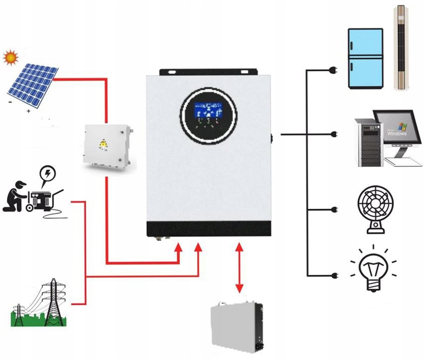 TTNERGY | МОЩНОСТЬ 3000Вт | МПРТ | SOLAR Солнечный инвертор PAL TTNergy Автономный инвертор соединяет фотоэлектрическую установку, накопитель энергии и электросеть. В течение дня он заряжает накопители энергии от фотоэлектрических панелей. Эта энергия затем питает бытовую технику от энергии, накопленной за день, а когда батарея разряжается, она берет энергию из сети.