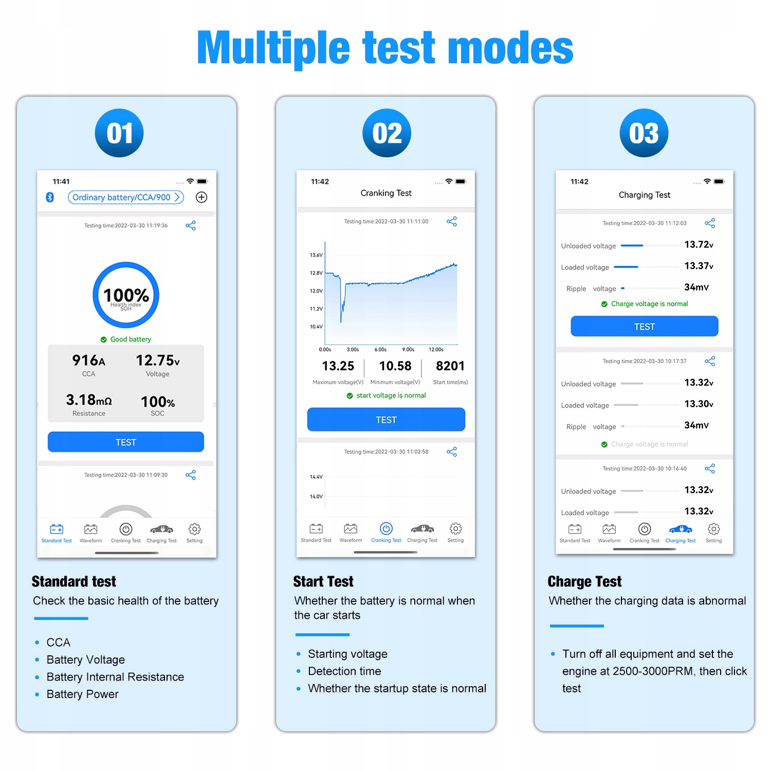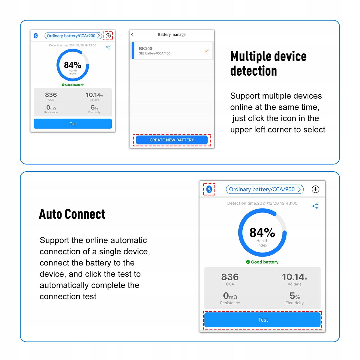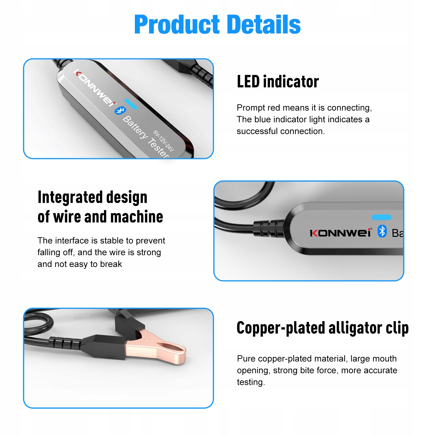 Измеритель аккумуляторов Konnwei BK200 — это современное устройство, позволяющее точно измерять и тестировать аккумуляторы транспортных средств. Благодаря широкому диапазону напряжения (6–12 В) и таким режимам тестирования, как нормальный тест, тест проворачивания и тест зарядки, он обеспечивает комплексную диагностику состояния аккумулятора. Кроме того, светодиодный индикатор и возможность считывания результатов измерений с помощью специального приложения делают использование этого прибора интуитивно понятным и удобным. Приложение совместимо с iOS (8 или новее) и Android (5.0 или новее), что позволяет отслеживать результаты измерений через смартфон. Безопасное подключение обеспечивается защитой от неправильного подключения. Прибор имеет широкий диапазон измерений CCA (100–2000) и является идеальным инструментом для профессионалов и автолюбителей.