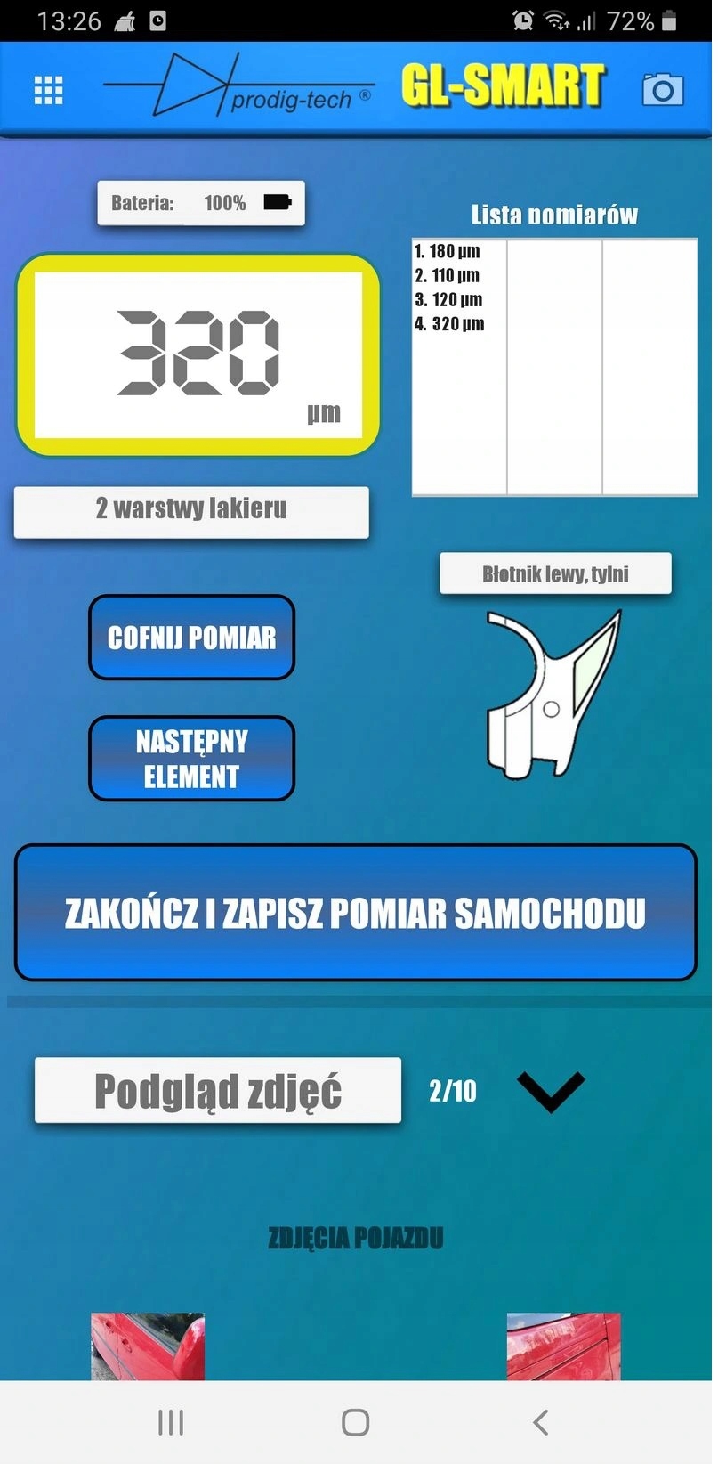 В профессиональном режиме также возможно сохранить измерение. С помощью счетчика GL-SMART-8 можно сделать до 10 фотографий измеряемого автомобиля. Для этого нажмите на значок камеры в правом верхнем углу приложения. Фотографии сохранятся в каталоге вместе с обмерами данного автомобиля. Фотографии сохраняются отдельно для каждого тестируемого автомобиля.