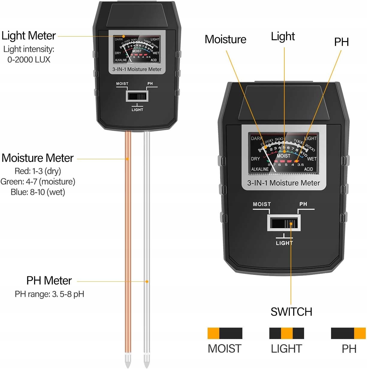 - Тестер почвы 3 в 1. Измеритель почвы имеет функцию 3 в 1 для проверки содержания влаги, уровня pH и уровня солнечного света, что позволяет поливать и удобрять растения в нужное время, обеспечивая оптимальные условия. Многофункциональный садовый инструмент, который вы не пропустите.