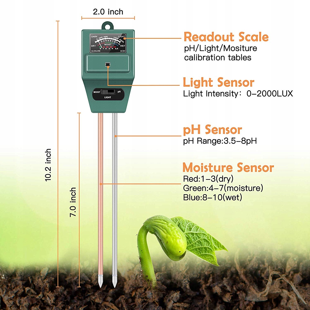 【Легко Использование】: не требуется батарея или электричество, просто вставьте сенсорный зонд в почву примерно на 2-4 дюйма, переключитесь, чтобы проверить влажность, pH, солнечный свет, которые вы хотите измерить, затем подождите несколько минут, пока индикатор не перестанет качаться, чтобы получить стабильное показание на шкале. Если растение очень сухое, индикатор почвы не будет колебаться, что означает, что растению нужна вода.