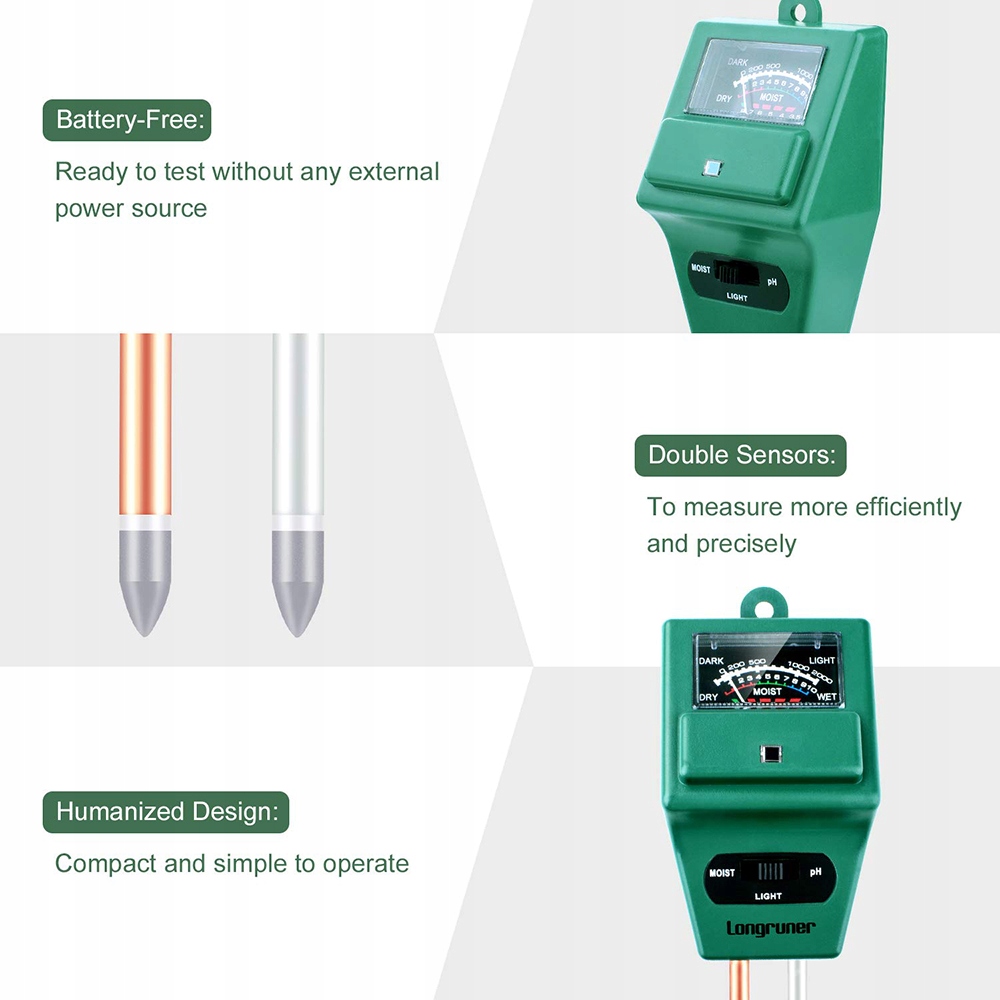 【Функция 3 в 1】 Вы можете проверить влажность почвы, значение pH и уровень солнечного света растения с помощью нашего измерителя, он может быстро помочь вам узнать, когда вам нужно полить растение, контролировать значение pH в почве и узнать, будет ли оно получать достаточно солнечного света.