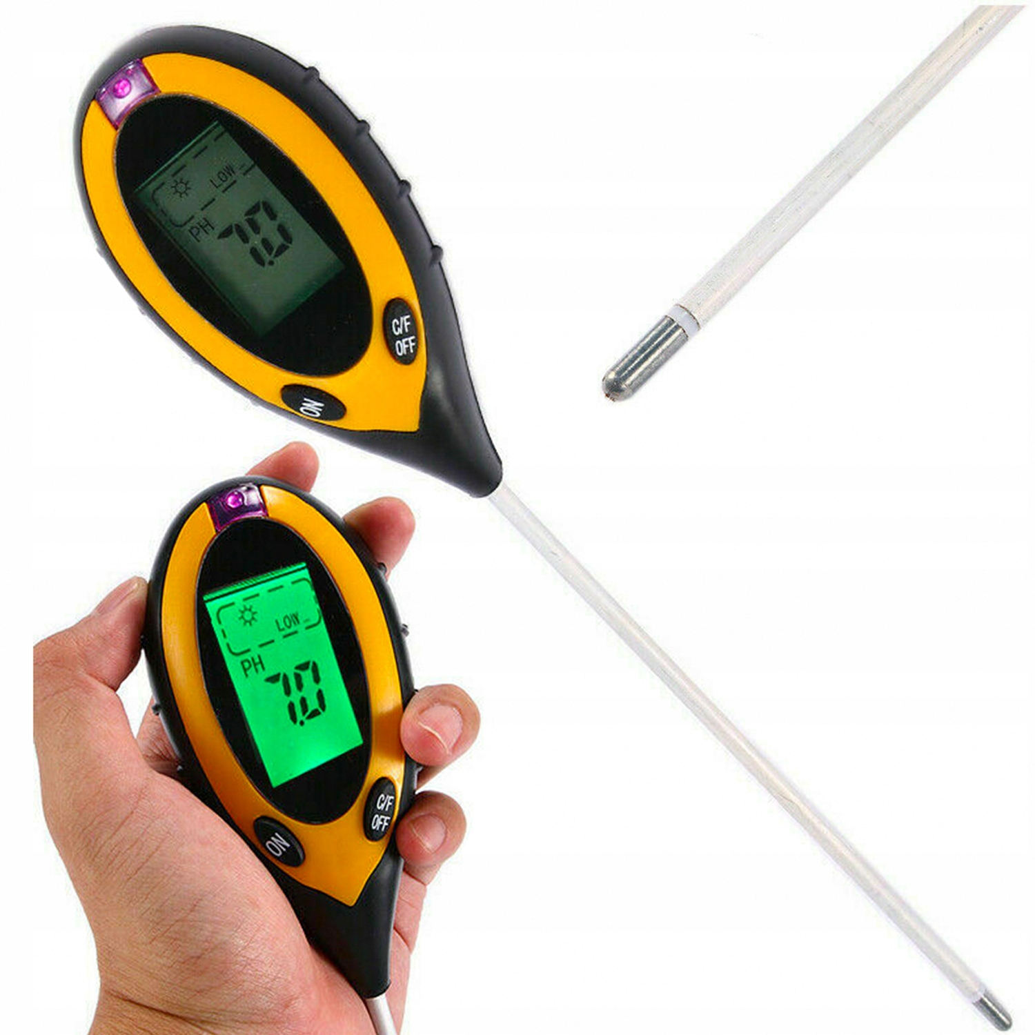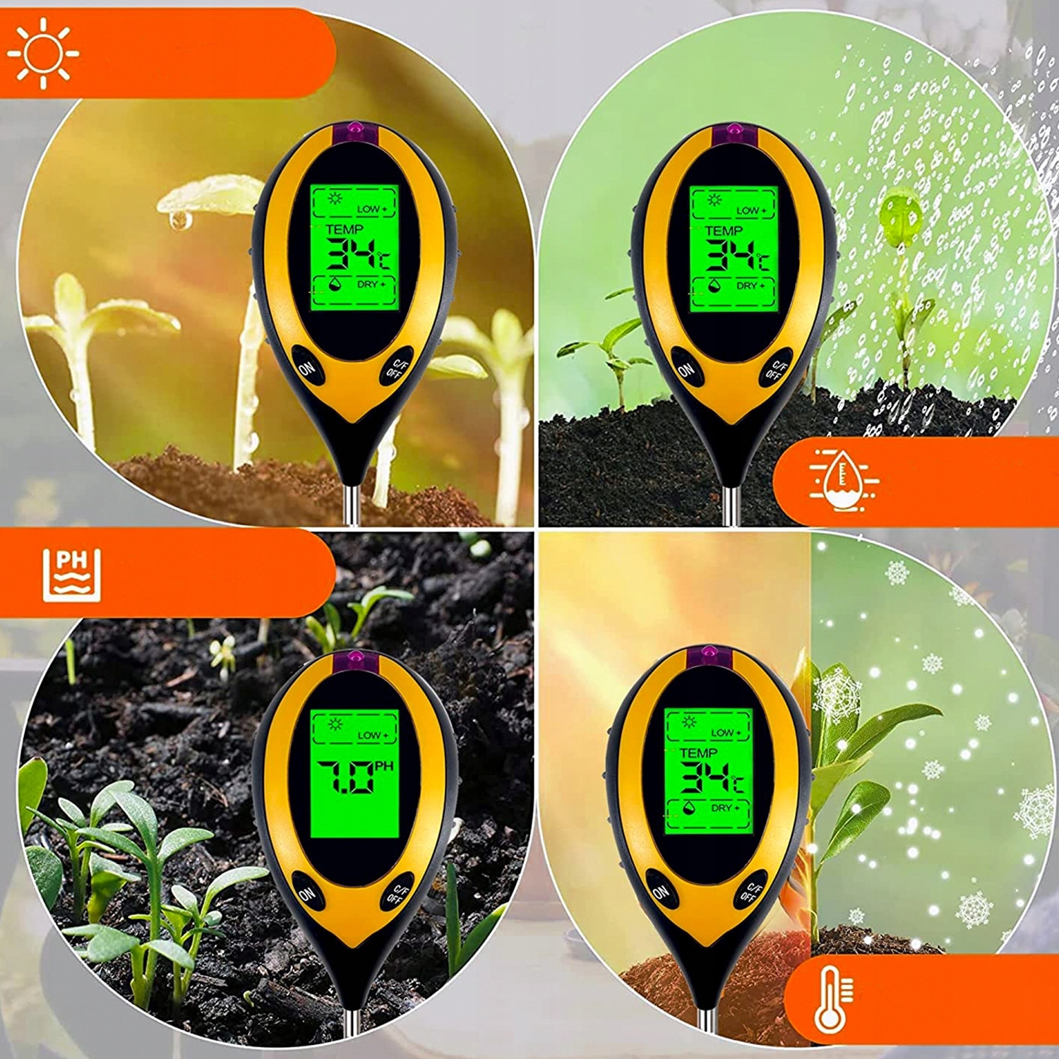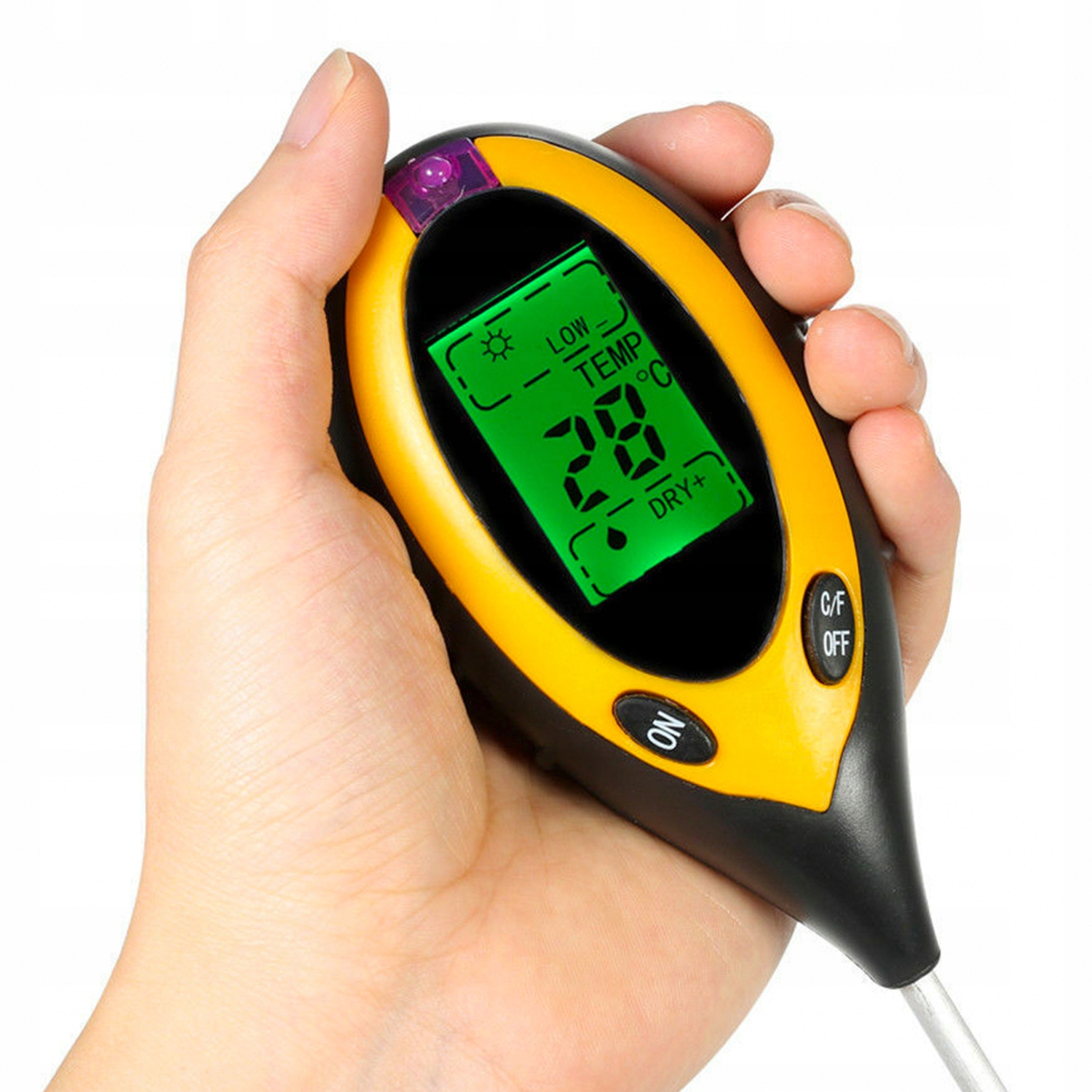 - Измеритель кислоты 4 в 1 с функциями измерения влажности почвы, температуры и солнечного света.