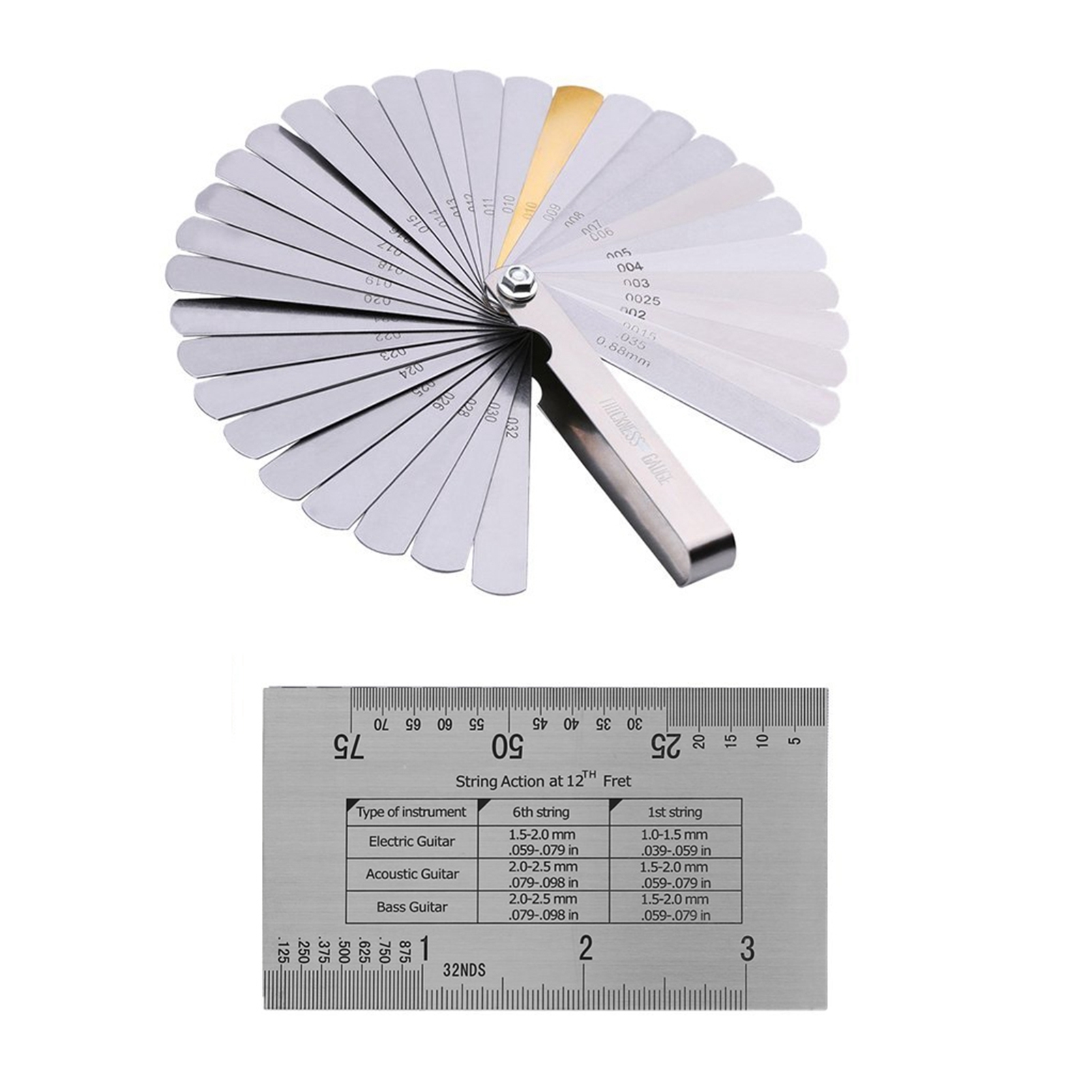 ⭐Особенность: ✅1. Этот продукт включает в себя 1 двустороннюю гравированную линейку, 2 накладки на гриф двух размеров и набор щупов из 32 предметов.