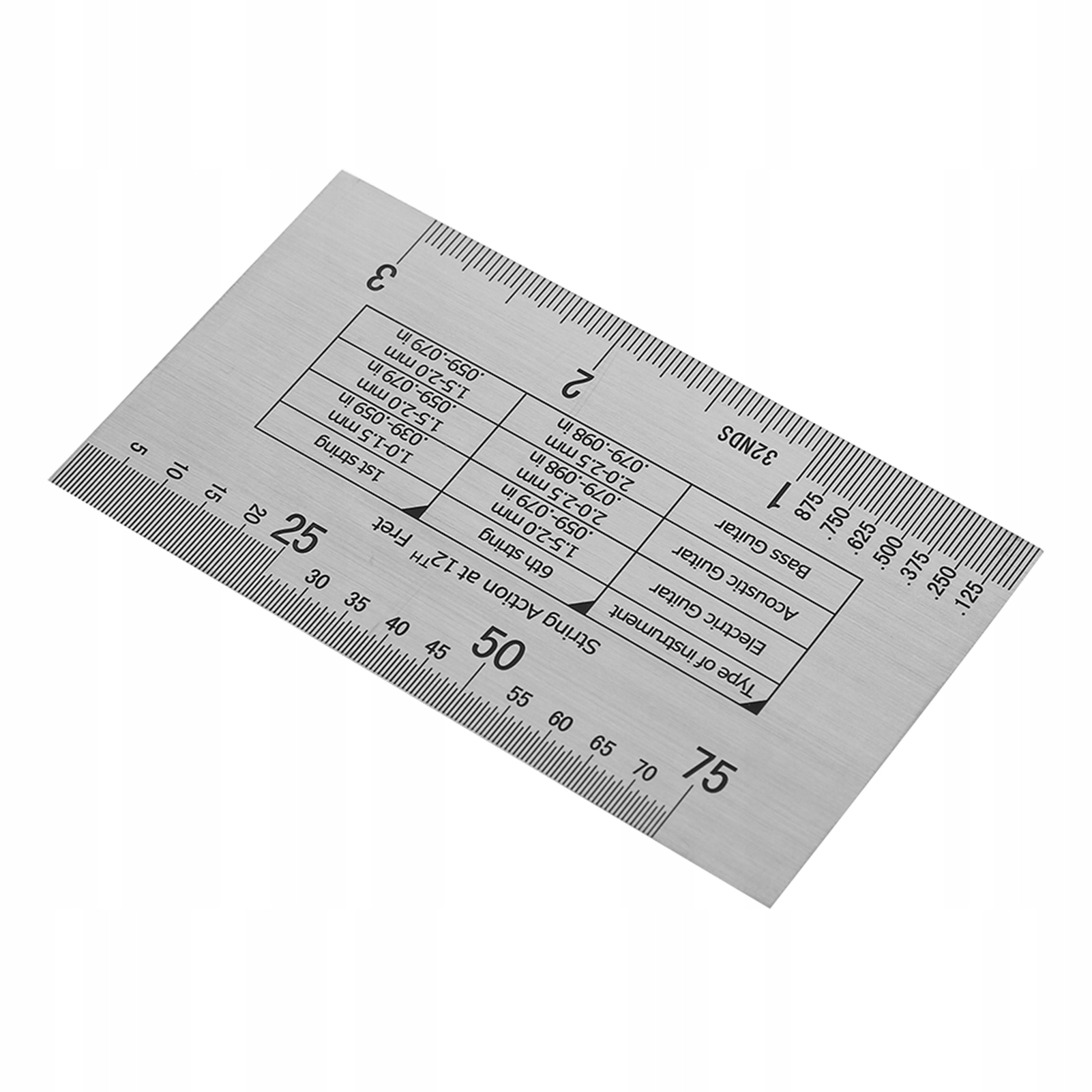 ✅Двусторонняя измерительная линейка включает в себя таблицу преобразования действия струны на 12-м ладу, точную шкалу для измерения высоты струны, высоты седла бриджа, глубины прорези седла, глубины прорези лада и высоты порожка, а также точного измерения других настроек.