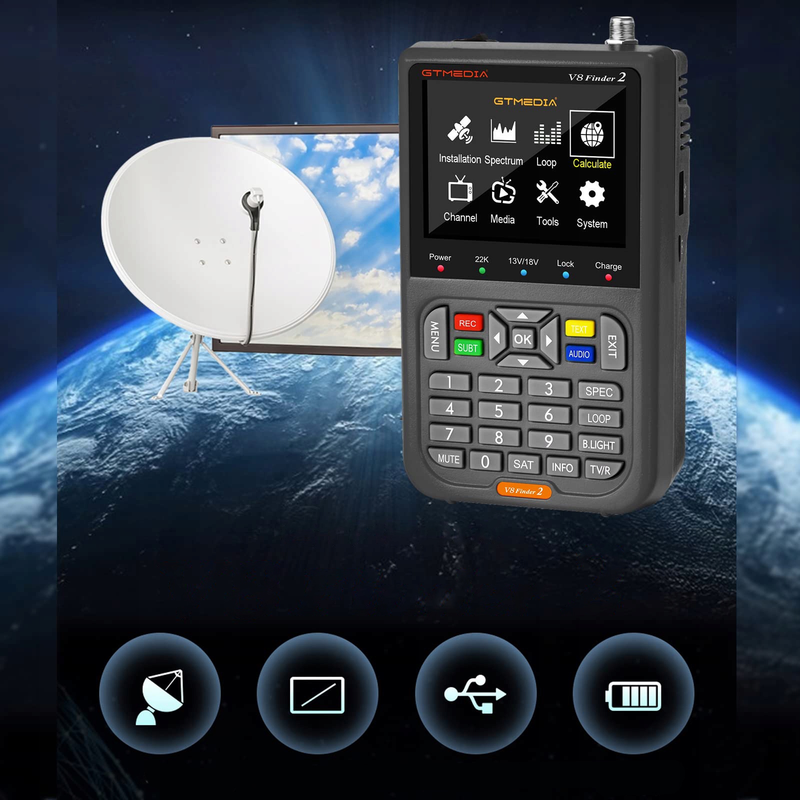 GTMEDIA V8 Finder 2 — это портативный измеритель спутниковой связи, совместимый со стандартами DVB-S/S2 и MPEG-2/4 H.264 (8-бит). Благодаря компактным размерам, небольшому весу, интуитивно понятному пользовательскому интерфейсу, длительному времени автономной работы и богатому набору функций счетчик предлагает все функции, необходимые для установки и проверки цифрового спутникового телевидения в частных и многоквартирных домах.