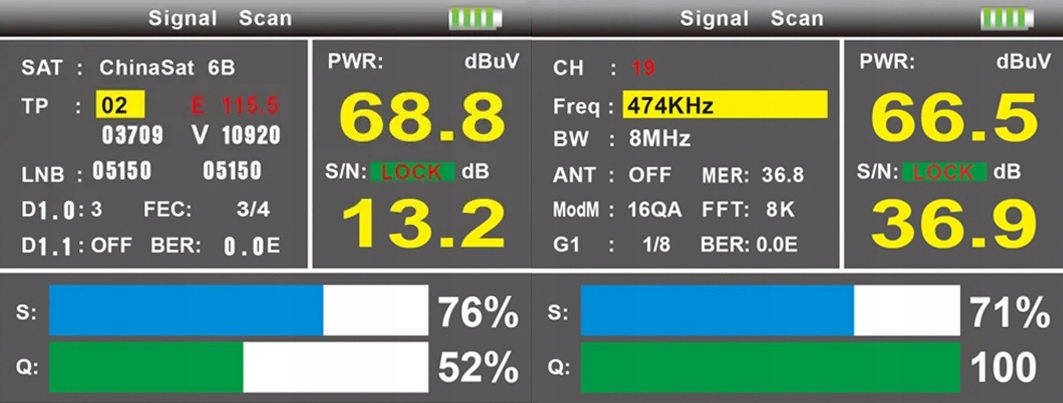 Кроме того, он имеет функции индикации ошибок BER, PWR, SNR. Встроенный анализатор спектра. Измеритель поддерживает все традиционные преобразователи SAT LNB и UNICABLE I/II SCR/DCSS. Измеритель SAT имеет встроенный гироскоп для регулировки угла и компаса.