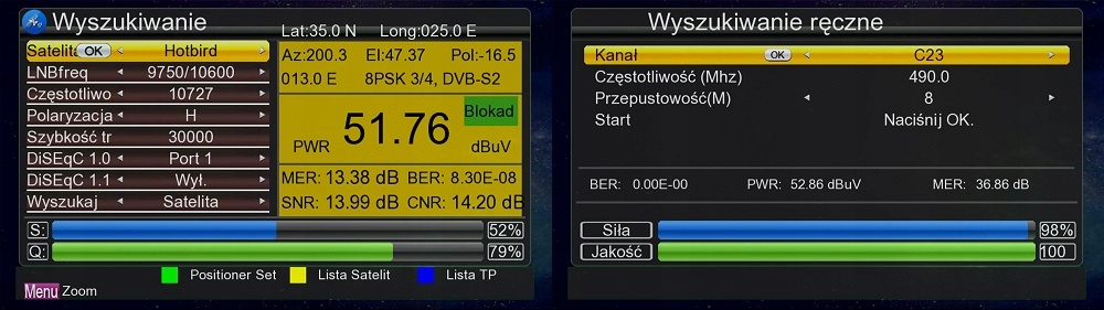 - Поиск спутникового сигнала после выбора спутника и частоты в %, PWR dBuV, dB, BER.