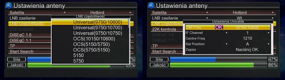 - Выбор спутника по частоте (спутниковый транспондер) с настройками порта DiSEqC. Поддержка преобразователей Unicable I с возможностью ввода до 8 параметров SCR и Unicable II с возможностью ввода до 32 параметров SCR