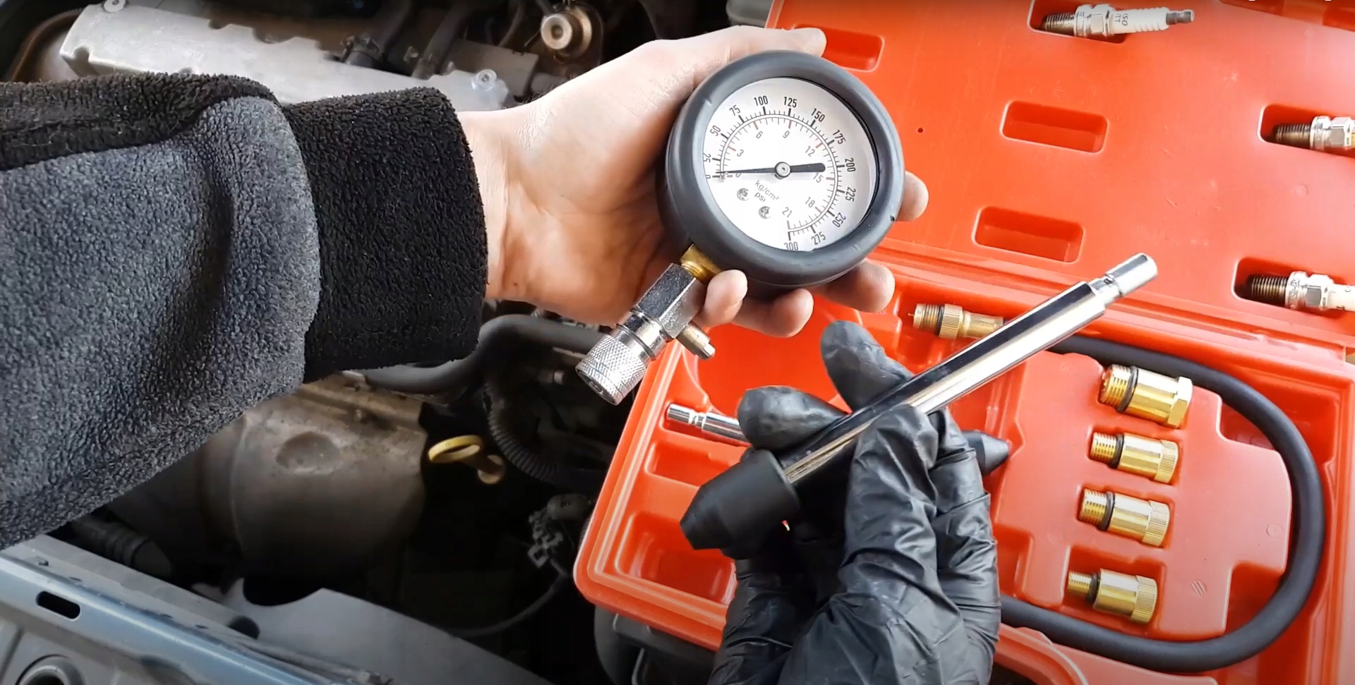 Тестер для проверки давления сжатия в цилиндрах бензинового двигателя с оборудованием, расширяющим его функциональные возможности.