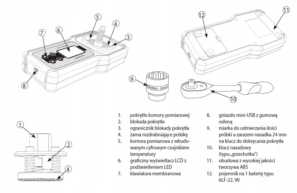 - Особенности - измельчение пробы, удобное измерение благодаря использованию ключа, все влагомеры Dramiński не требуют периодического обслуживания для калибровки прибора