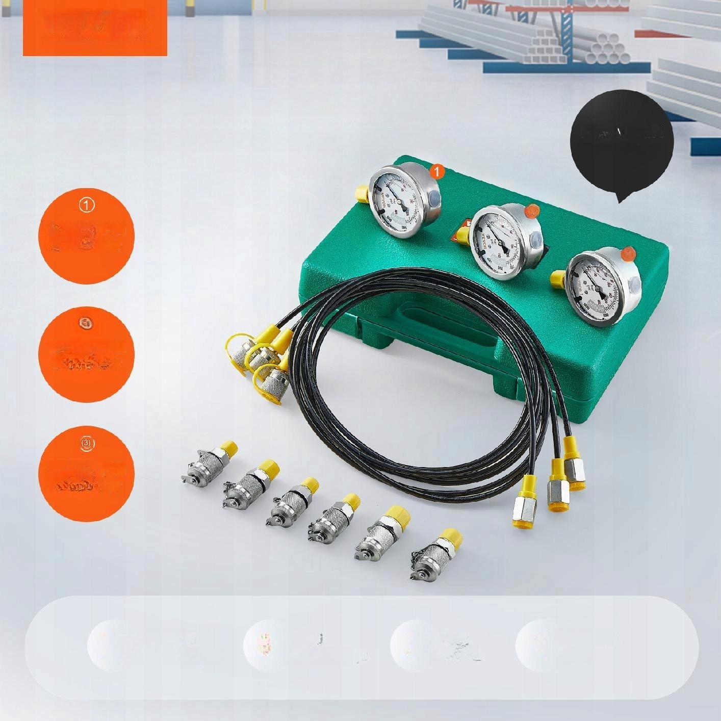 комплект для тестирования гидравлического давления, необходимый на каждом промышленном заводе с использованием гидравлических устройств. Он содержит три тестовых манометра и шесть тестовых разъемов, предоставляющих широкий спектр возможностей для точных измерений давления в различных гидравлических устройствах.