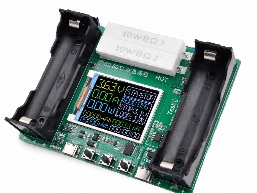 Тестер элементов 18650 позволяет измерять емкость и внутреннее сопротивление элементов и имеет возможность заряжать элементы через встроенный порт USB-C. Тестер имеет две корзины для ячеек: корзина справа предназначена для проверки ячеек, а другая слева — для питания системы.