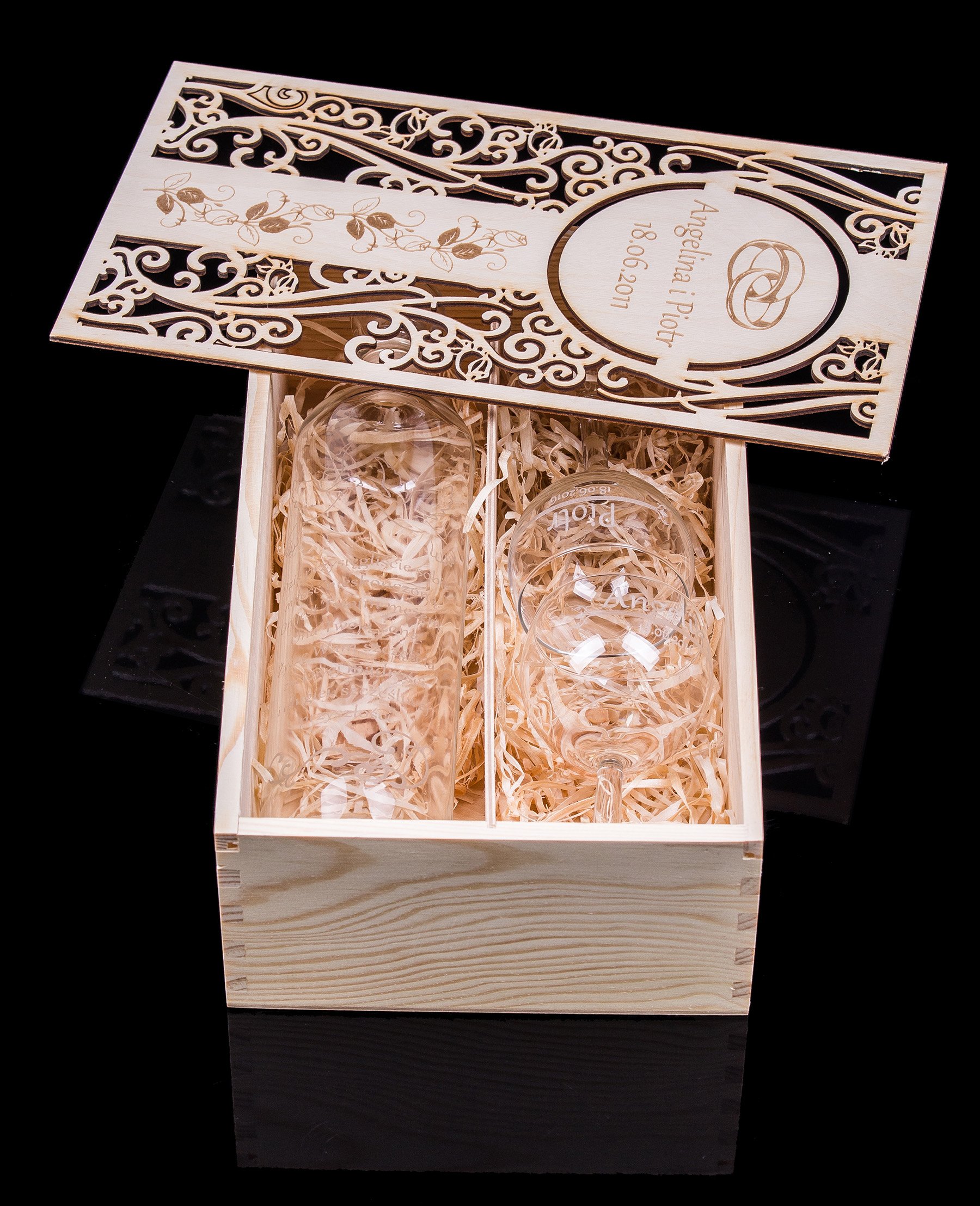Представляем Вам бокалы и графин с гравировкой и шкатулку из натурального дерева, вырезанную и персонализированную лазером. Наш набор с вашим индивидуальным подходом станет прекрасным подарком на свадьбу, благодарственным подарком родителям или любому другому торжеству. Представленные графин и стаканы прекрасно вписываются в коробку, что делает ее отличным, неповторимым подарком.