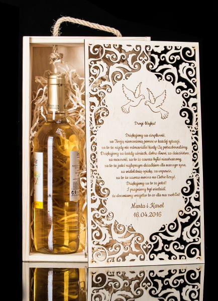 Представляем Вам очки с гравировкой и шкатулку из натурального дерева, вырезанную и персонализированную с помощью лазера. Наш набор с вашим индивидуальным подходом станет прекрасным подарком на свадьбу, благодарственным подарком родителям или любому другому торжеству. Бутылка вина и бокалы прекрасно вписываются в коробку, что делает ее отличным и уникальным подарком.