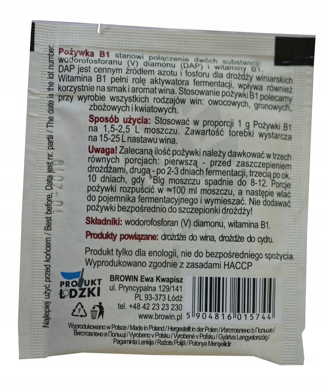 Помимо диаммонийфосфата он содержит витамин В1 (тиамин) и декстрины, связывающие токсичные для дрожжей вещества. Витамин В1 стимулирует рост дрожжей и является сильным активатором брожения. Расфасована по 10 г, хватит на 25 литров.