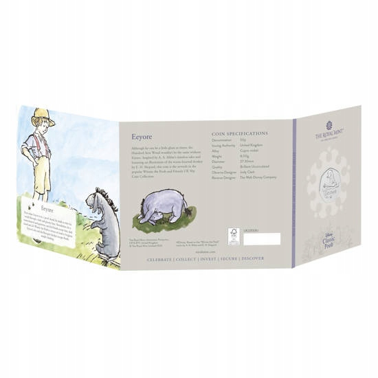 Номинал отчеканен из медно-никелевого сплава, весом 8 грамм и диаметром 27,30 мм. За производство монет отвечает известный Королевский монетный двор. Кроме того, британское правительство гарантирует валюте ее законность, чистоту и происхождение металла, а также является законным платежным средством в стране-эмитенте. Товар имеет индивидуальную сертифицированную упаковку. На аверсе монеты изображено изображение королевы Великобритании Елизаветы II. Также можно найти информацию о году чеканки и номинальной стоимости ценной бумаги. Дизайн аверса разработал Джоди Кларк. На реверсе изображена фигура сидящего Иа, надпись «Уа», а также логотип Диснея. Дизайнером реверса был Э.Х. Шепард.