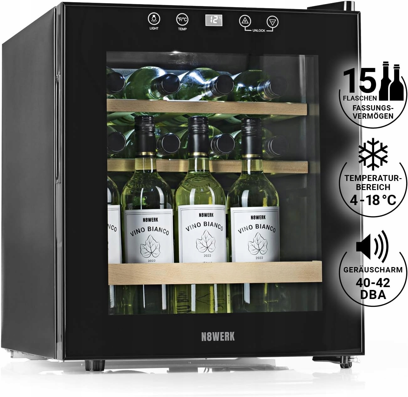 n8werk Wine Holdge | До 15 бутылок вина тихой компрессорной технологии Отличный диапазон температуры 4 ° C - 18 ° C | С тепловым остеклением ЖК -дисплея светодиодное освещение h1>