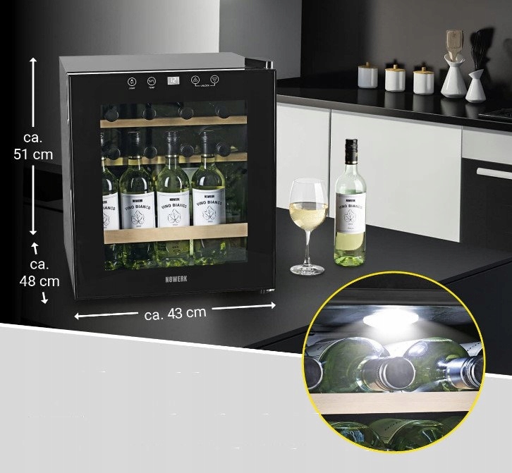 - Optimal cooling of the wine cooler has a door with a thermal glass, and the temperature adjustment range is from 4 C to 18 C at a room temperature of 25 C (temperature display in ° C and ° f LED: You can display your treasures - modern LED interior lighting of the N8WERK Винный кулер с компрессором Стильно обнажает ваше вино