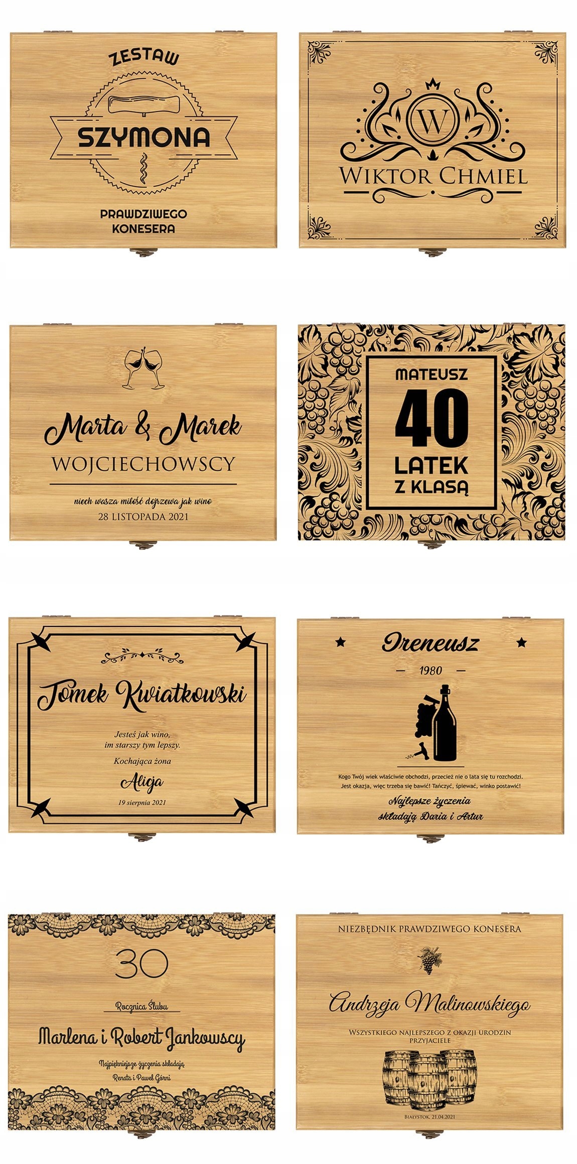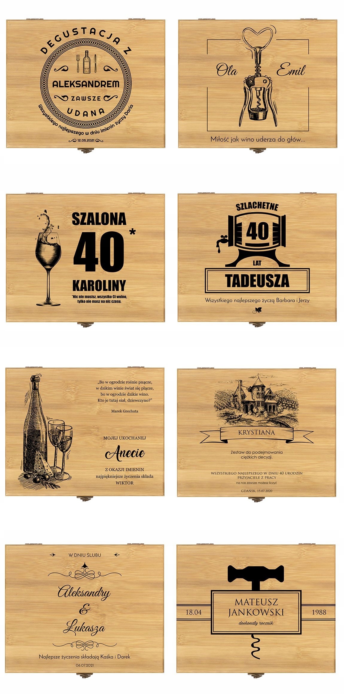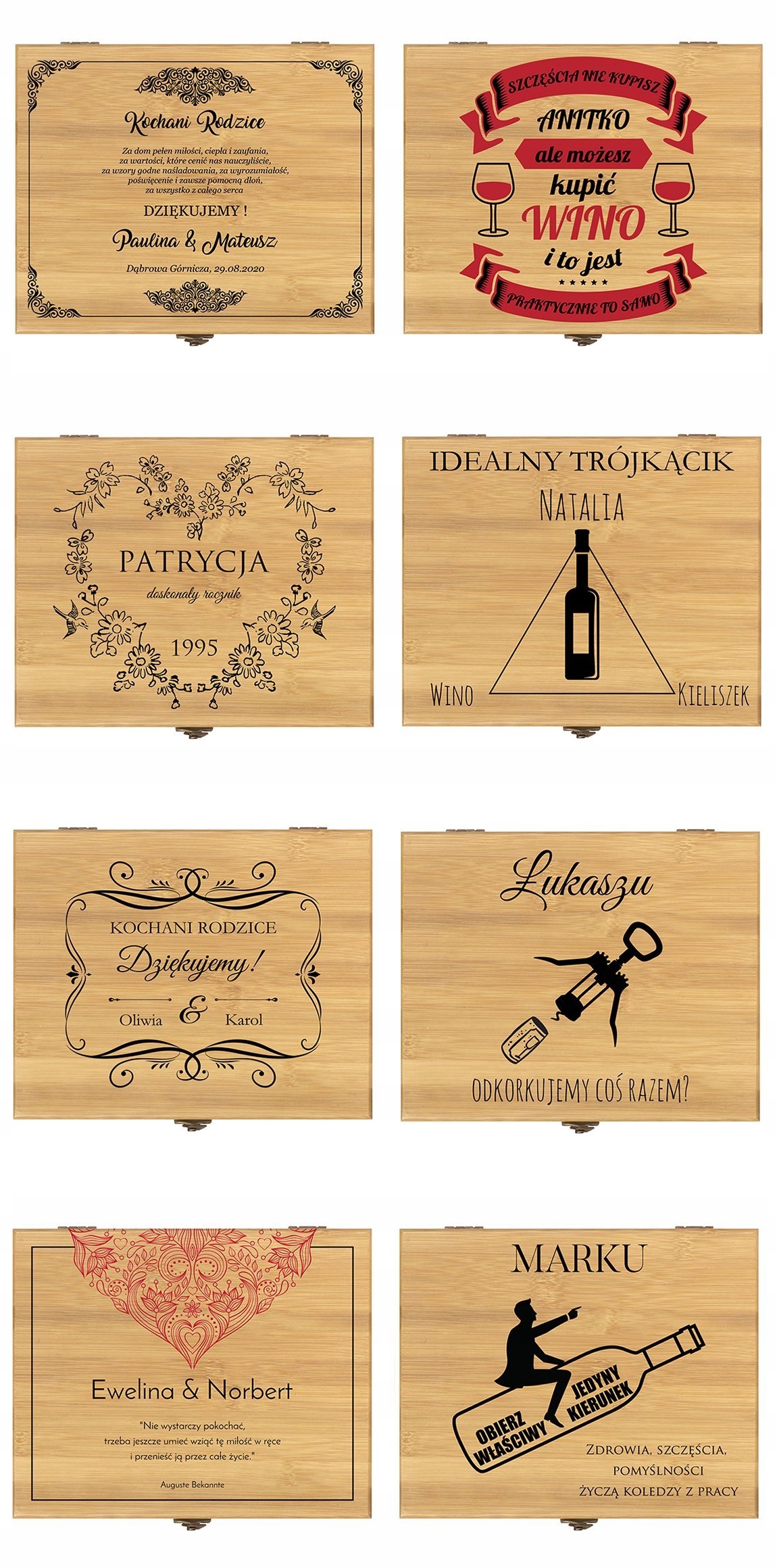 Ищете элегантный подарок, подходящий ценителю вина? Хорошая идея – это, конечно, бутылка любимого напитка. Однако чтобы подарок был интересным и функциональным, стоит дополнить его чем-то еще. Мы подготовили для вас идеальное предложение для завершения подарка – изысканную бамбуковую шкатулку с профессиональным набором аксессуаров. В комплект входят: штопор с горизонтальным рычагом и запасным сверлом, две привлекательные пробки (в том числе одна с функцией перелива), нож для фольги, подставка для штопора и кольцо для горлышка бутылки, чтобы не капало. Элементы набора изготовлены из высококачественной нержавеющей стали и пластика. На крышке коробки мы напечатаем индивидуальное поздравление по вашему выбору. У вас есть возможность подарить любимому человеку что-то совершенно уникальное!