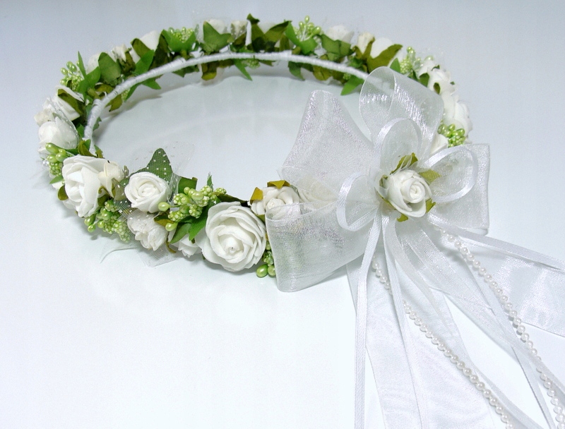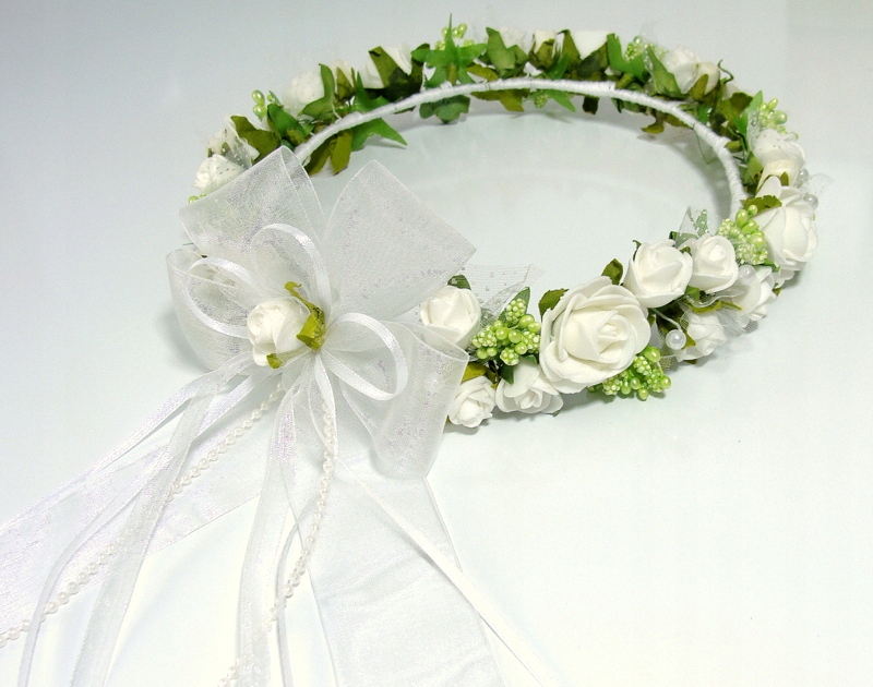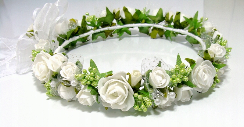 Очаровательный венок из пенопластовых роз белого и зеленого цвета.