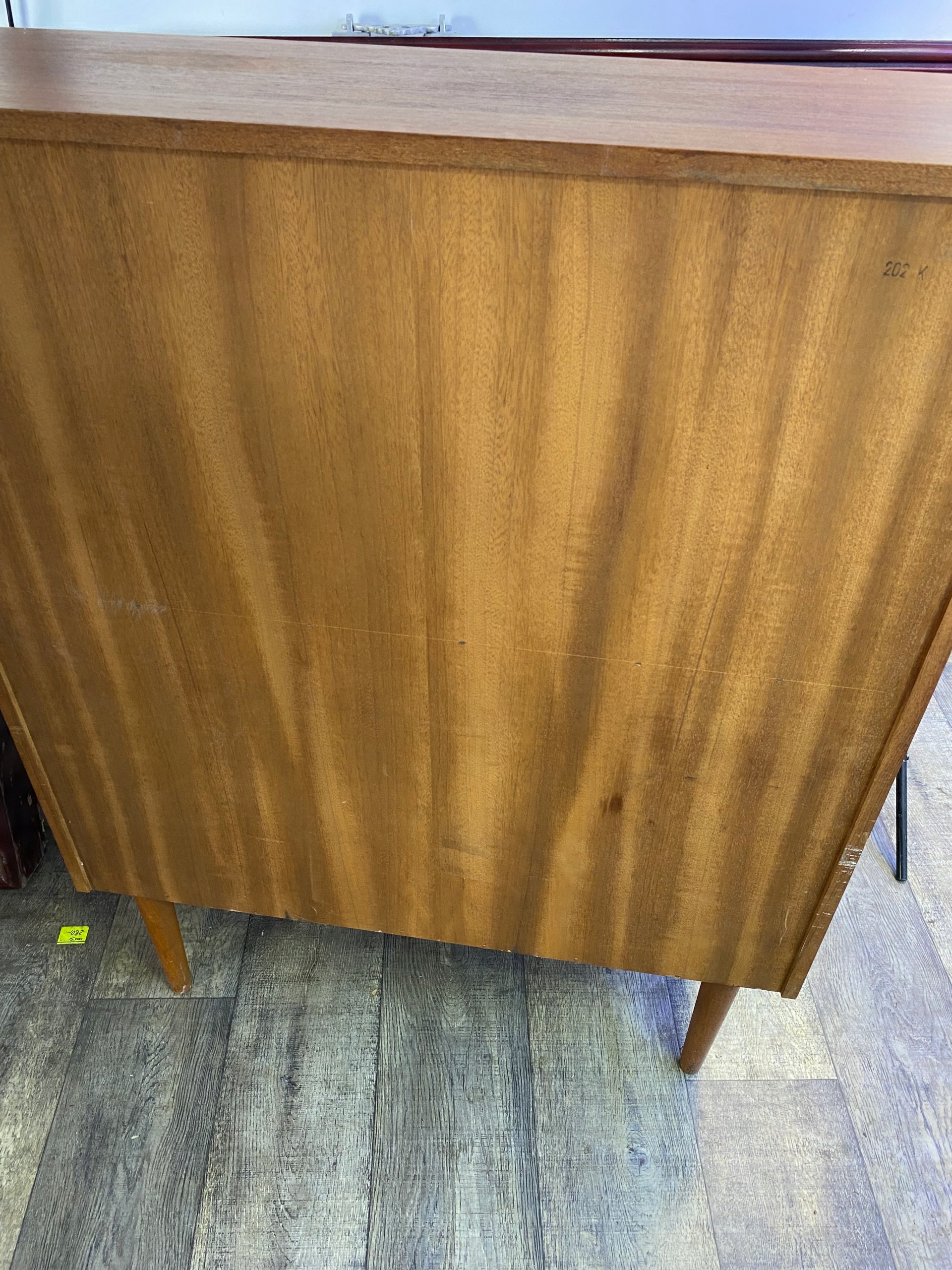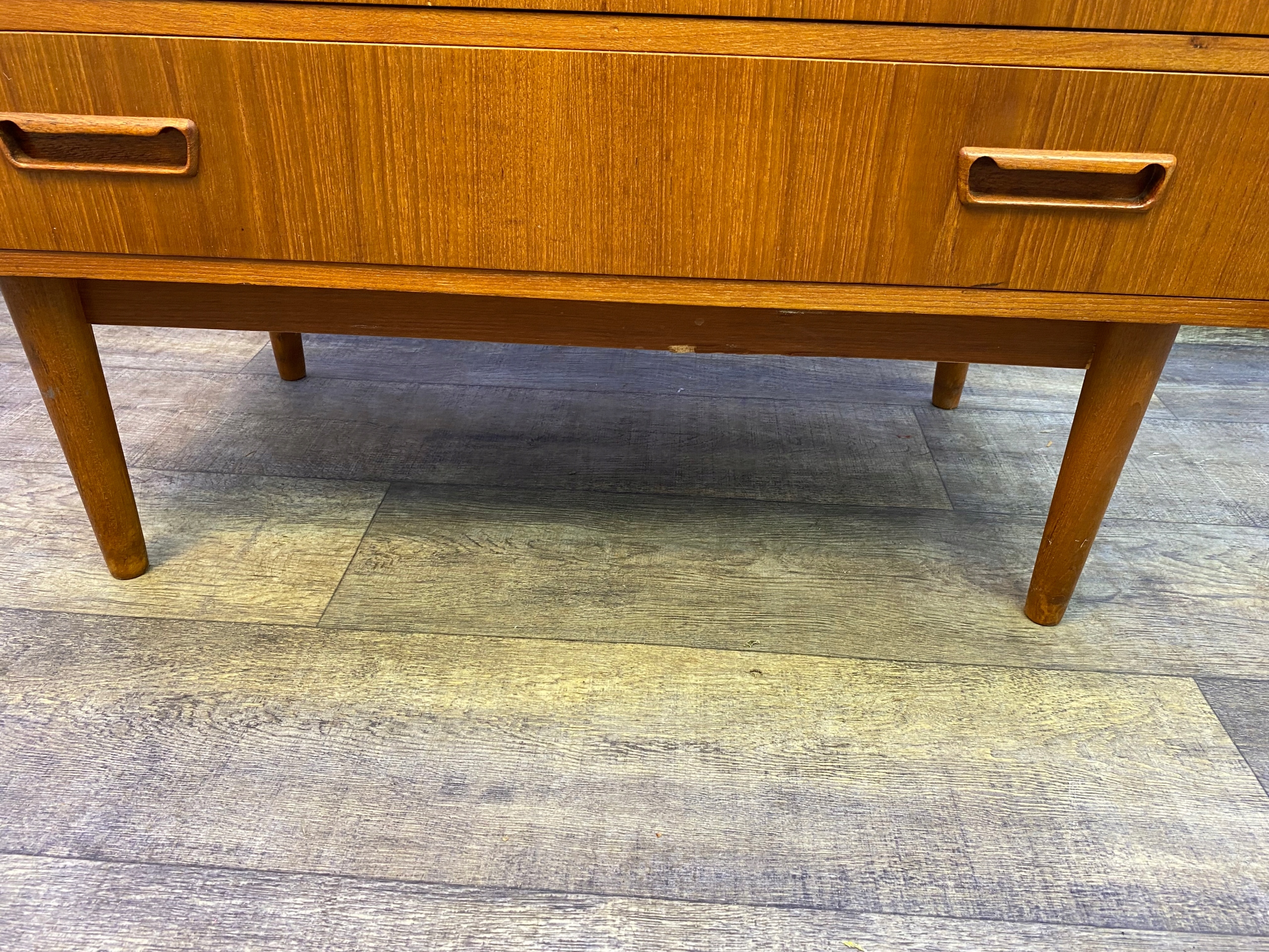 Корпус из тикового шпона со столешницей /высота 70 см/, 3 большими и 4 маленькими ящиками из массива дерева и типичными конусообразными ножками,
