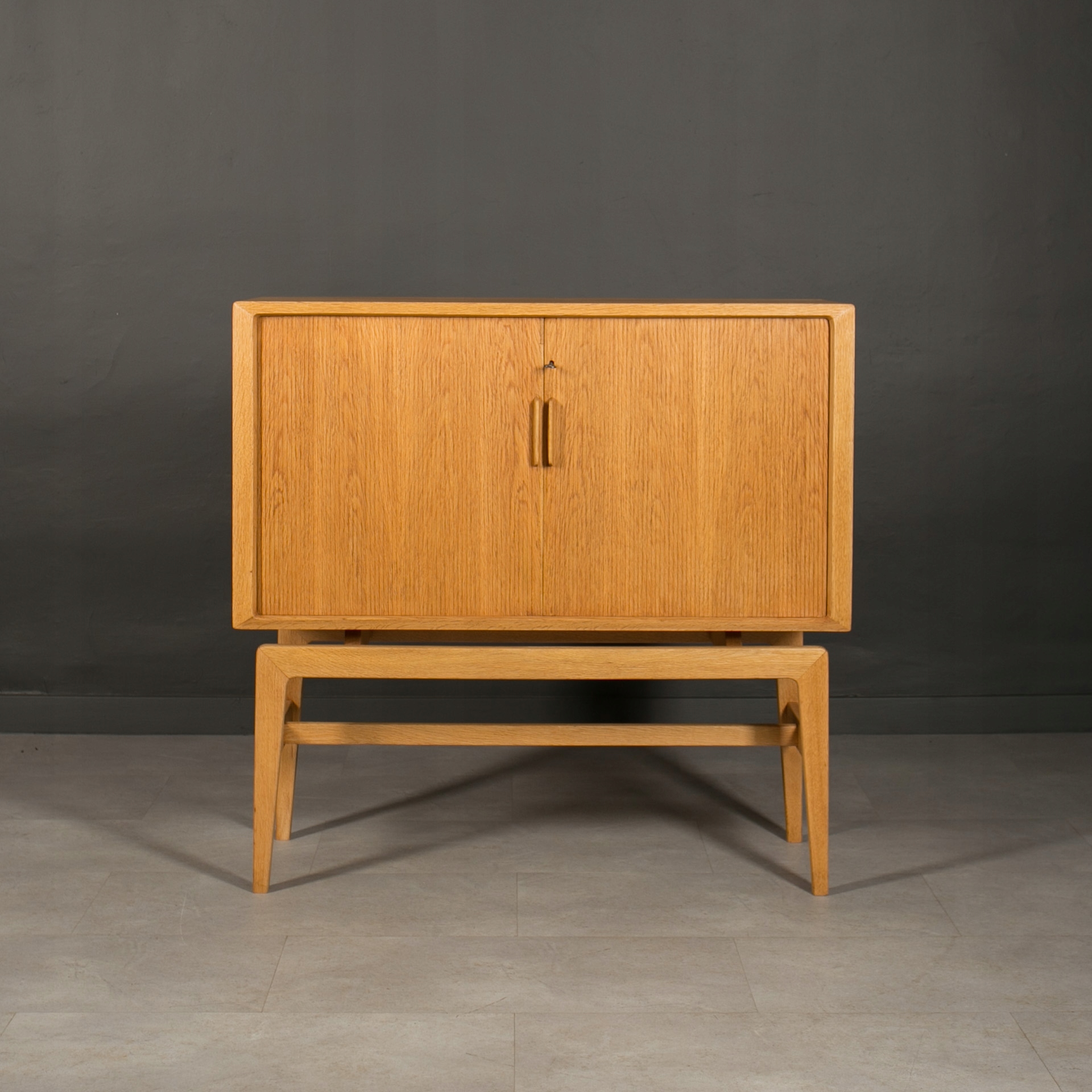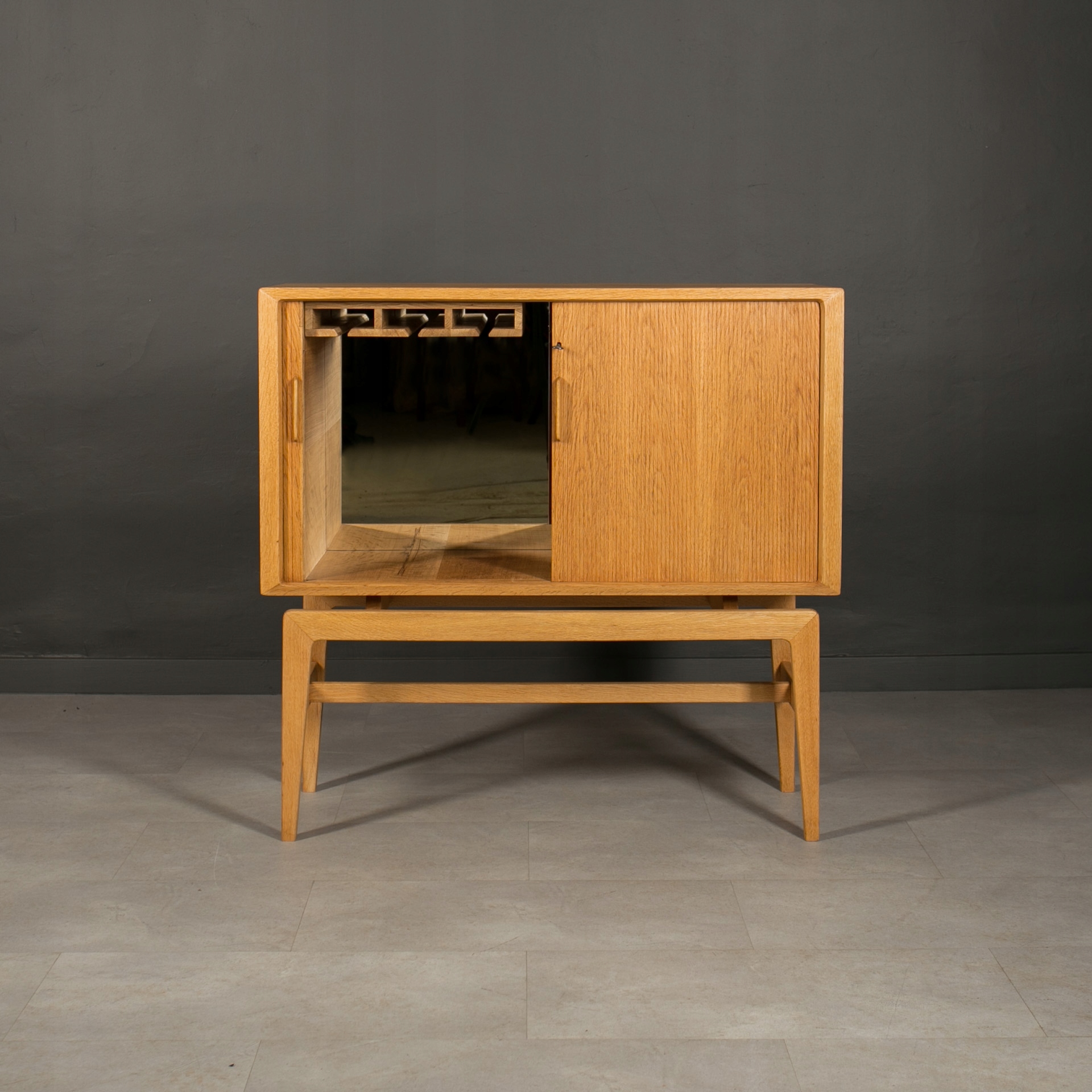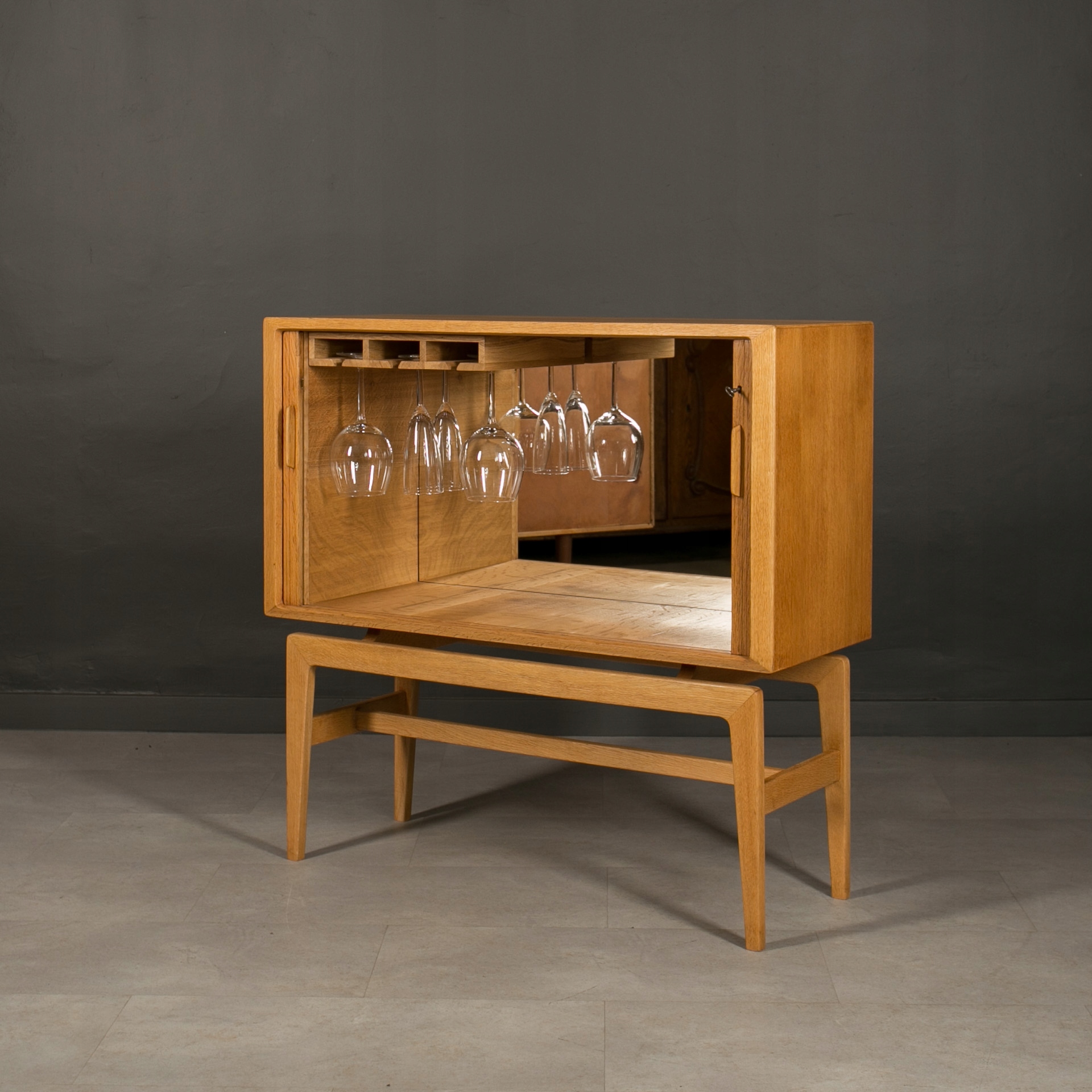 Бар для хранения и подачи напитков, Норвегия, 1960-е годы. Это уникальный предмет мебели из Скандинавии, изготовленный из древесины дуба. Красивые раздвижные двери в виде жалюзи придают ему уникальный характер. Интерьер бара практичен, оснащен держателями для подвешивания стаканов, что делает его идеальным местом для хранения и подачи напитков. Внутри есть зеркало, вмонтированное глубоко в заднюю стену. Элегантную форму мебели подчеркивают четыре стройные высокие ножки. Это идеальное сочетание функциональности и эстетики в скандинавском стиле.