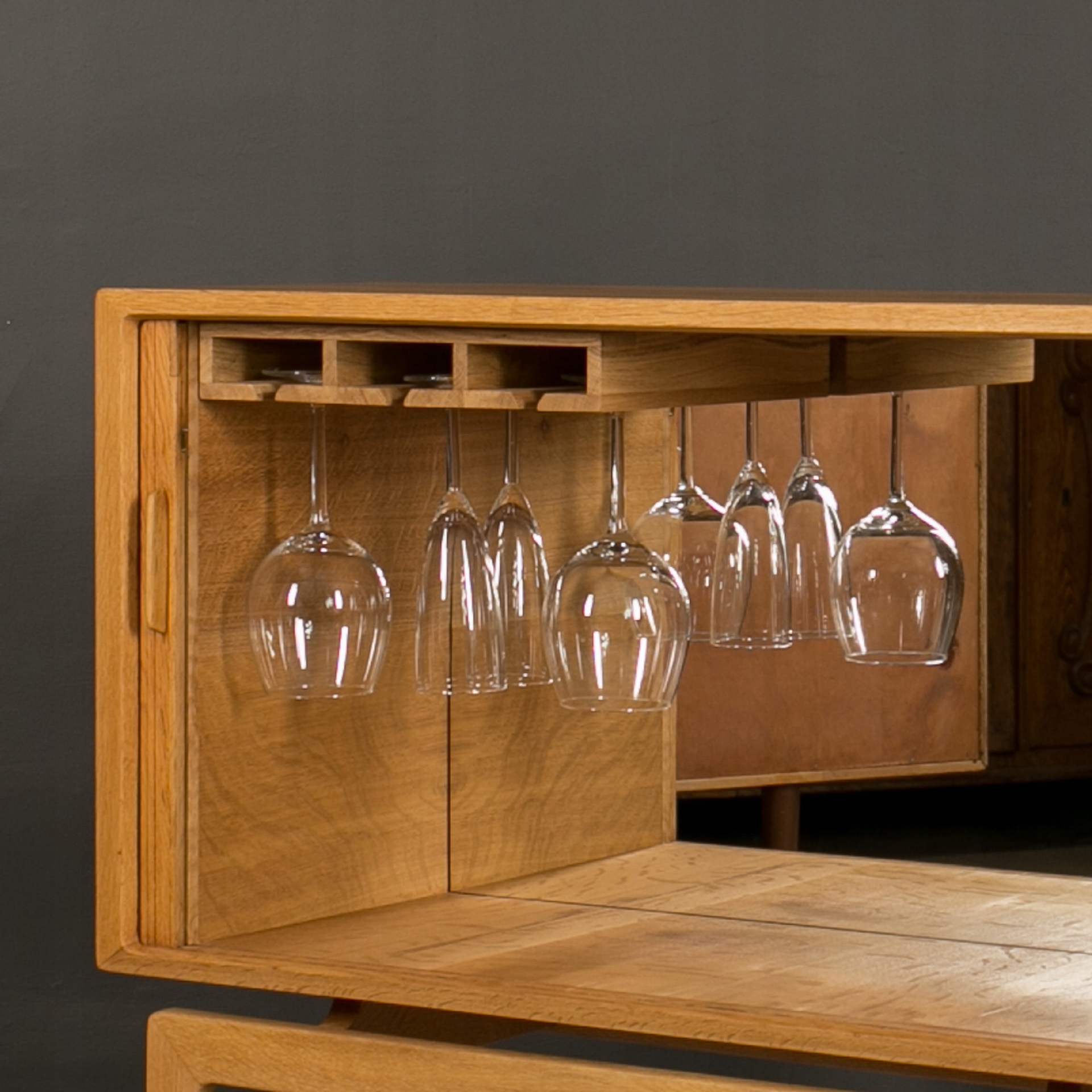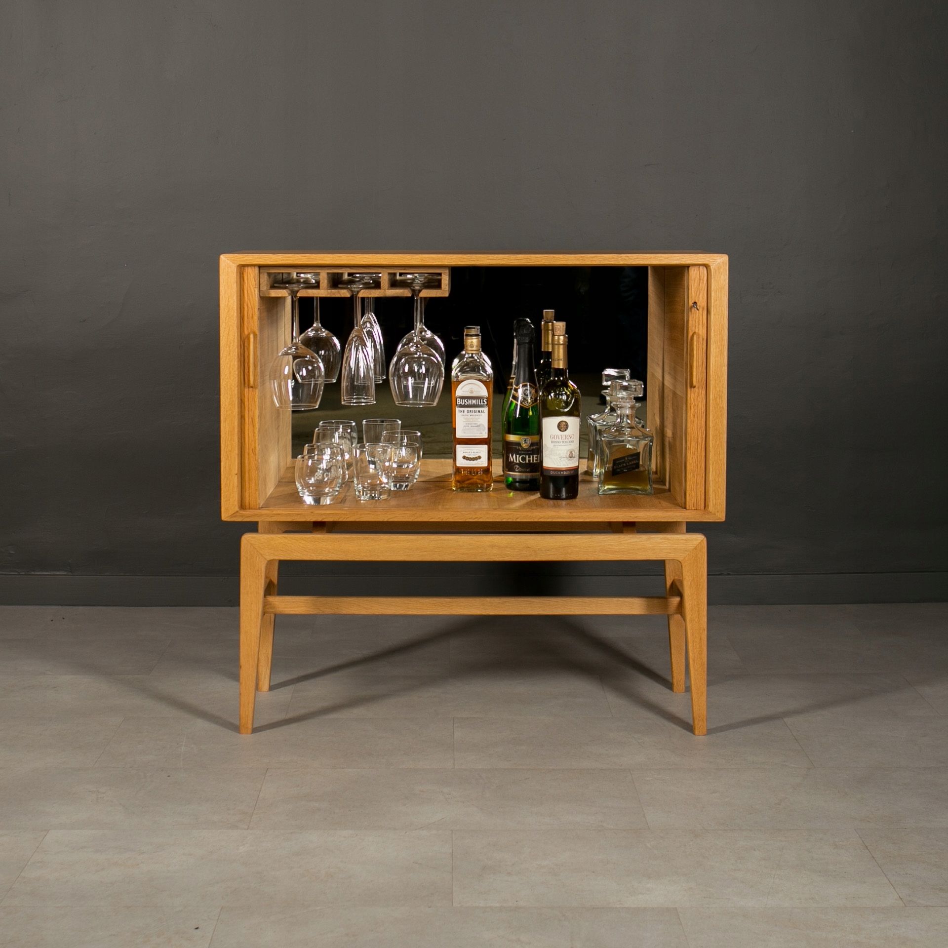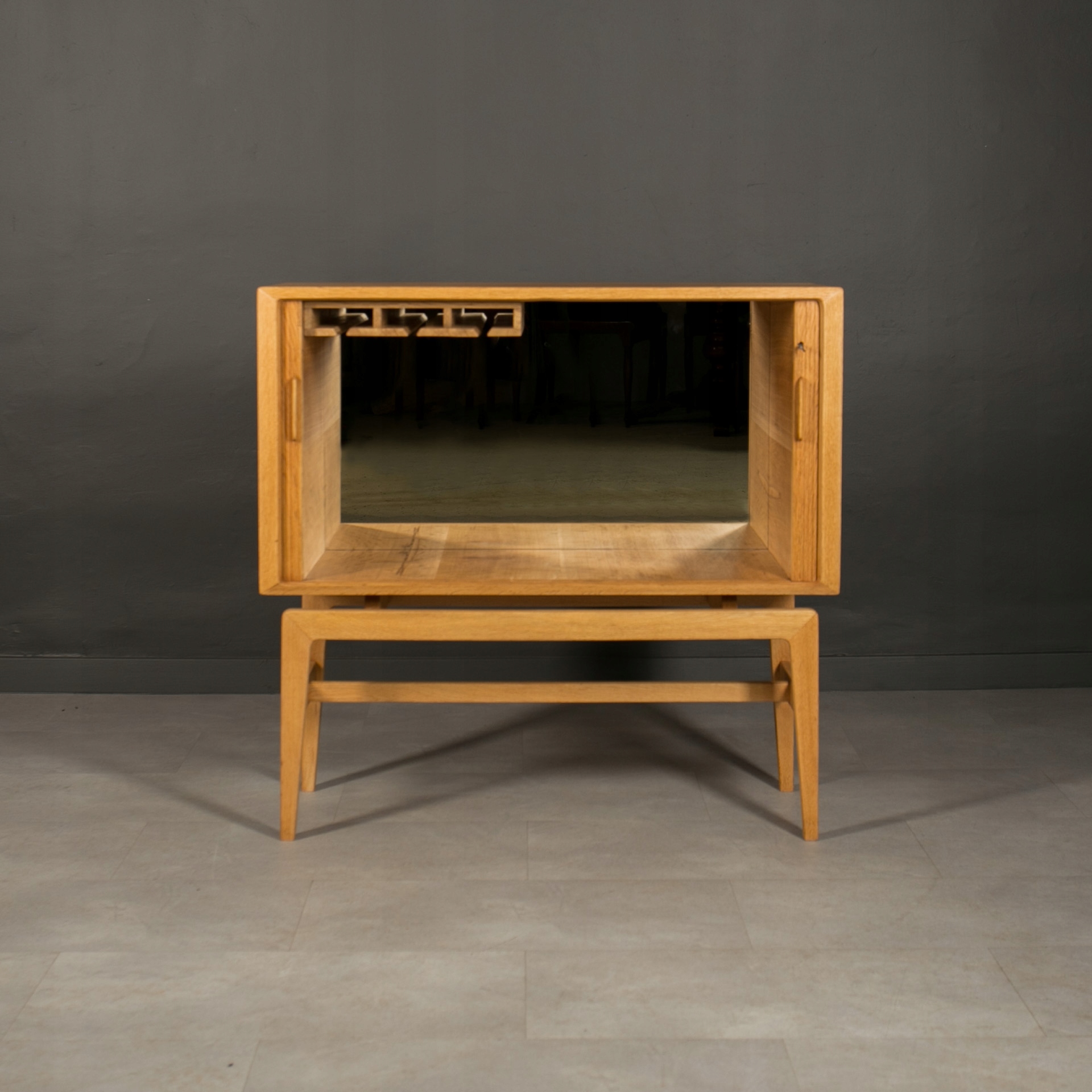 Бар для хранения и подачи напитков, Норвегия, 1960-е годы. Это уникальный предмет мебели из Скандинавии, изготовленный из древесины дуба. Красивые раздвижные двери в виде жалюзи придают ему уникальный характер. Интерьер бара практичен, оснащен держателями для подвешивания стаканов, что делает его идеальным местом для хранения и подачи напитков. Внутри есть зеркало, вмонтированное глубоко в заднюю стену. Элегантную форму мебели подчеркивают четыре стройные высокие ножки. Это идеальное сочетание функциональности и эстетики в скандинавском стиле.