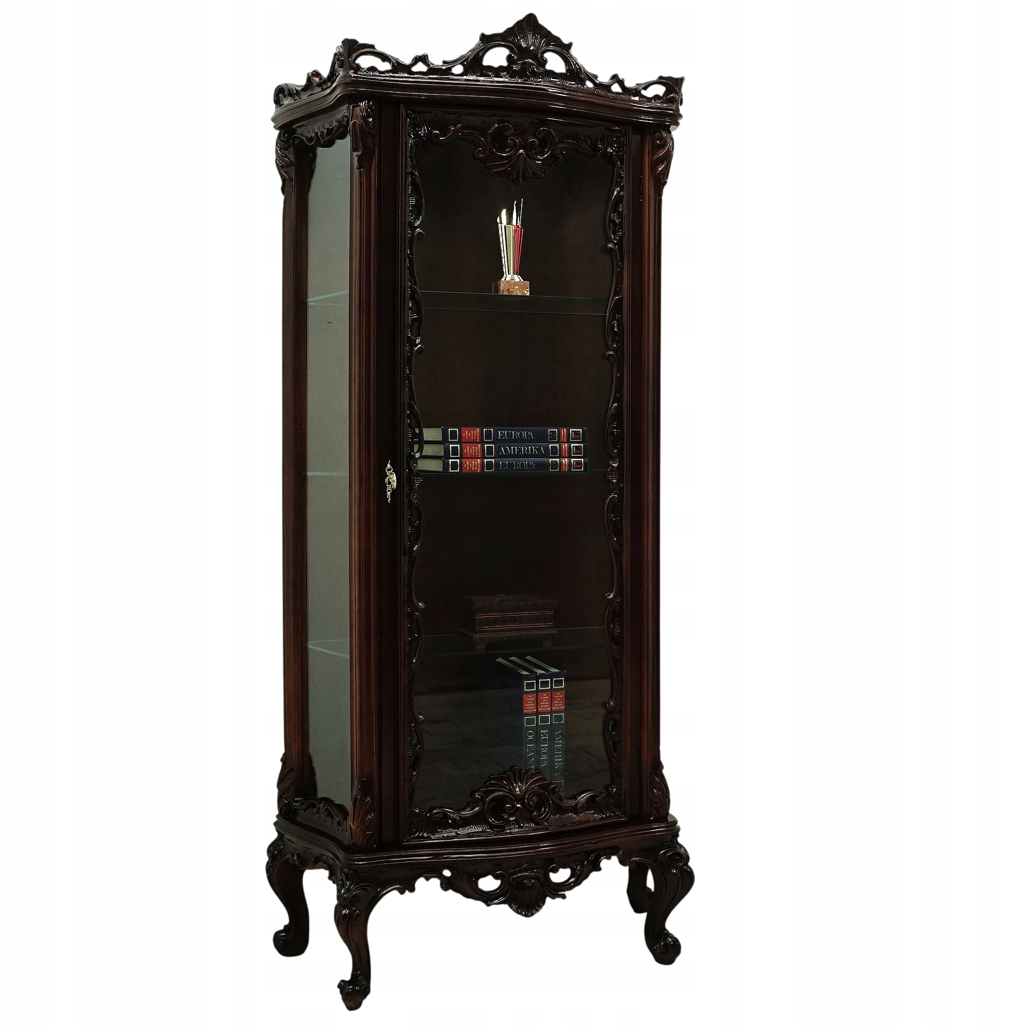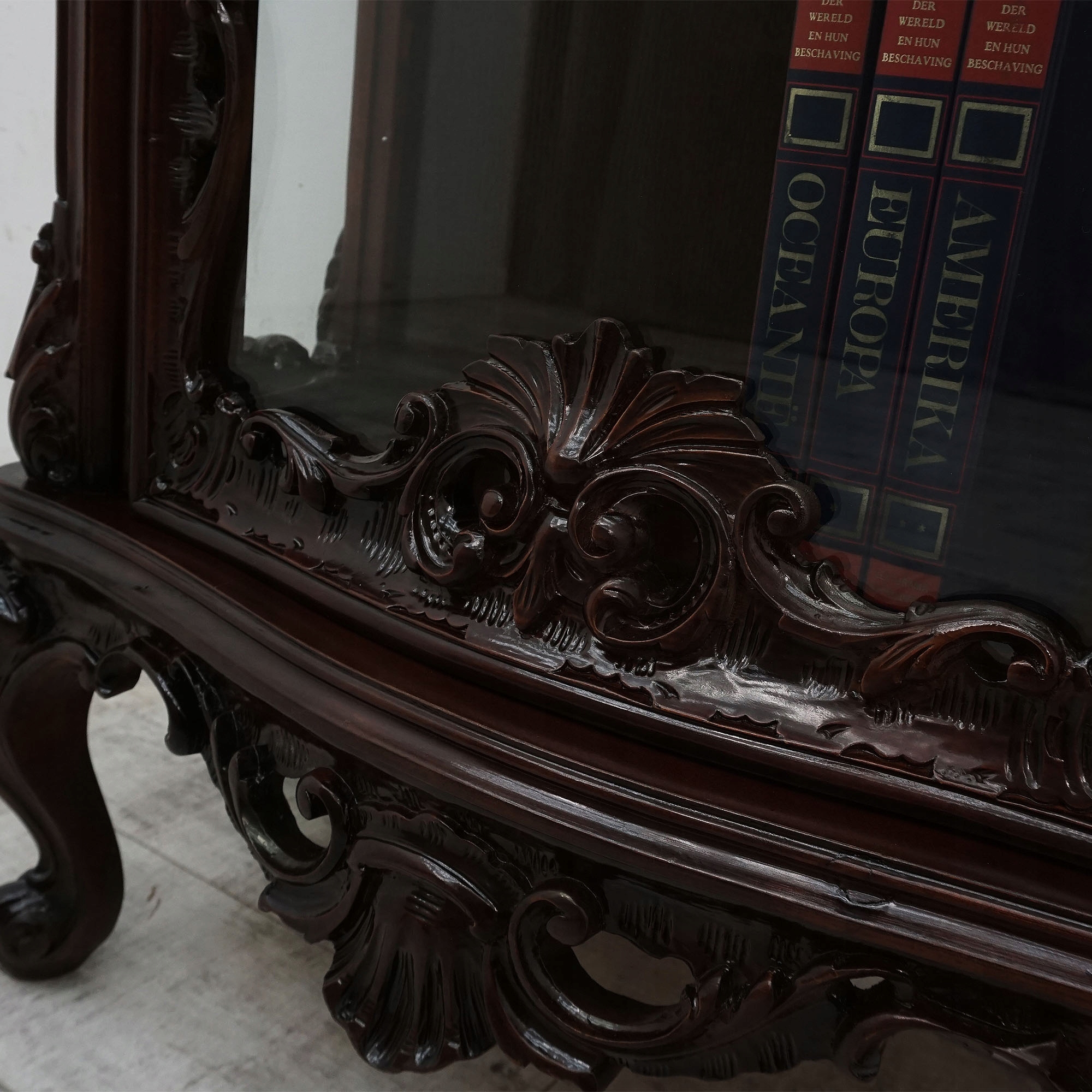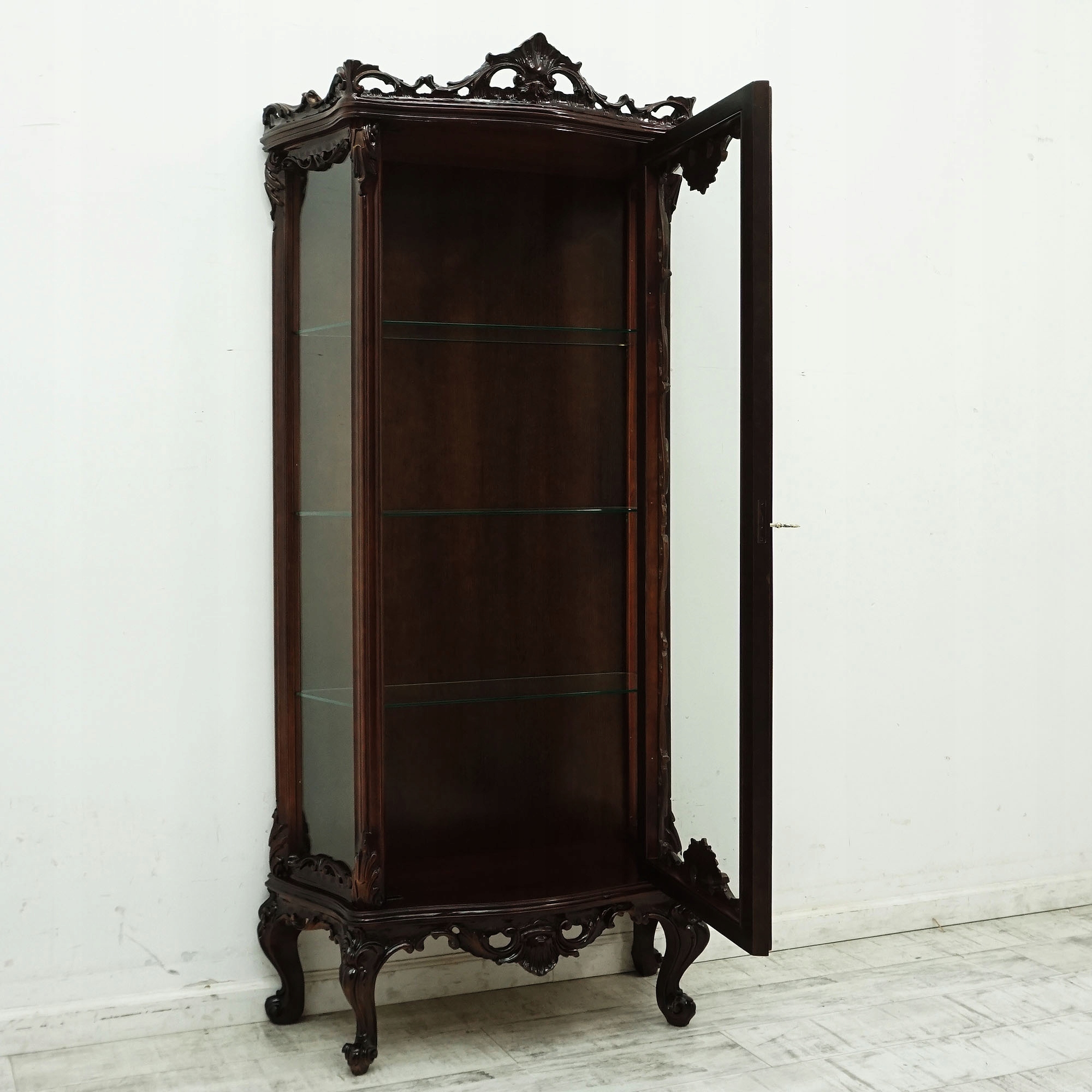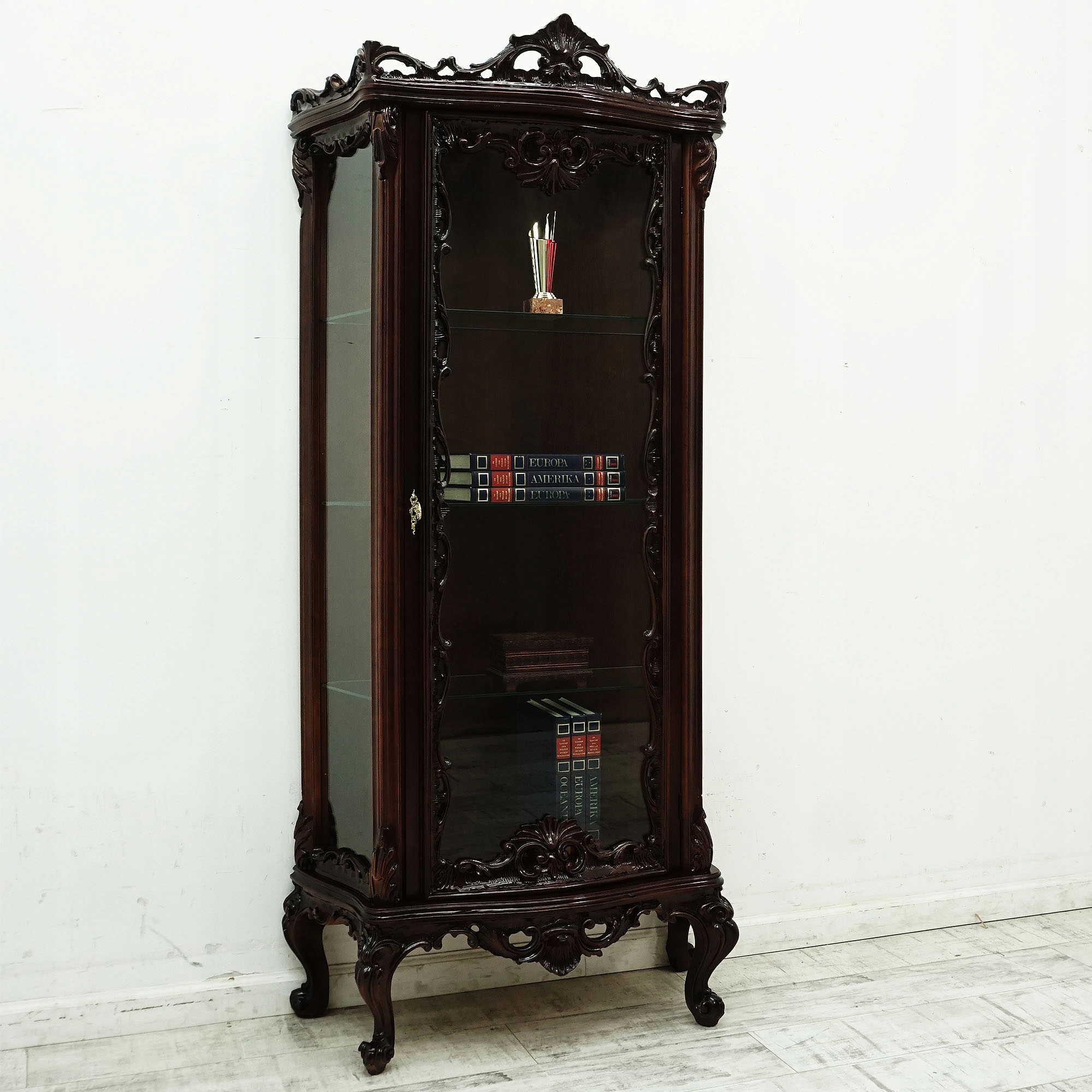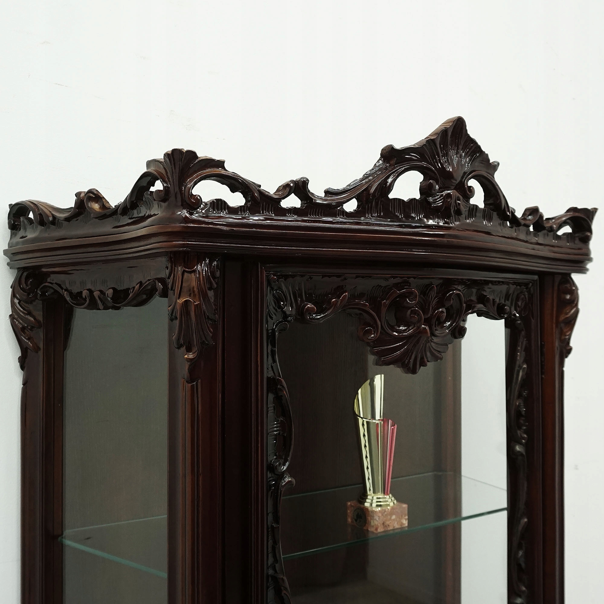 Эта уникальная витрина представляет собой квинтэссенцию элегантности, вдохновленной стилем барокко. Богато резная форма, замысловато украшенный навершие и изящно изогнутые ножки притягивают взгляд и придают интерьеру дворцовый характер. Глубокий темный оттенок дерева в сочетании с глянцевой отделкой подчеркивает неподвластную времени эстетику мебели.