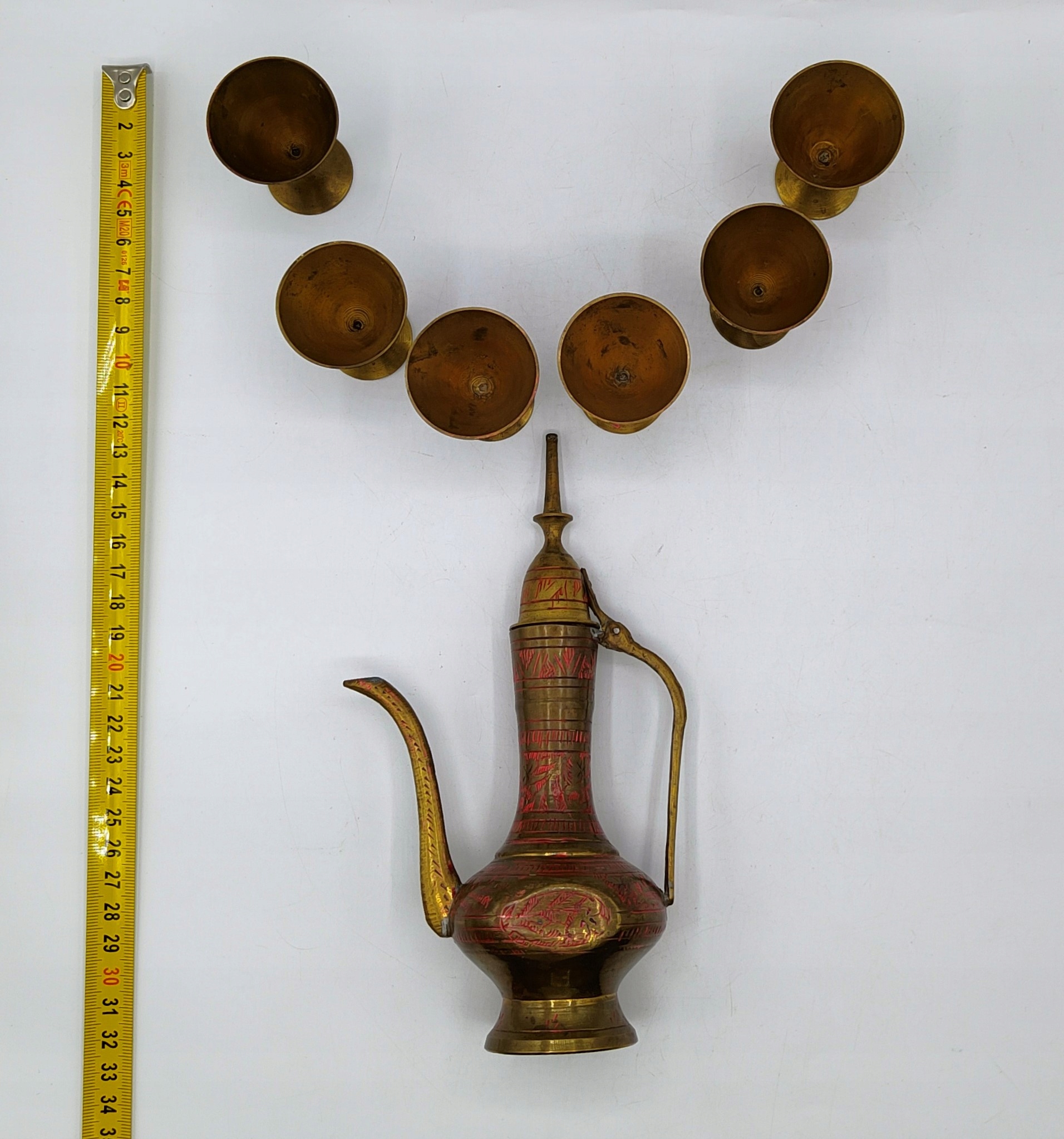 набор ручной работы из латуни. Рукописное и окрашенное. Высота мопса 19 см, емкость 100 мл, стекло составляет 6 см с вместимостью 25 мл, вес набора более 0,4 кг. Уже стационарные предметы, винтаж, что вы можете увидеть. Живи, они выглядят так же красиво, как на фотографиях. Я рекомендую!