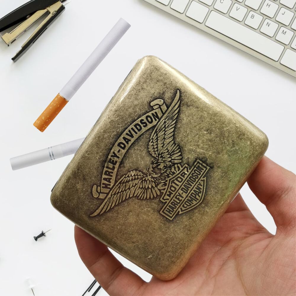 Металлический портсигар в винтажном стиле: гладкая поверхность, накатка с медным покрытием, гравированный рисунок, удобный и легкий в переноске, прочный. Он очень подходит деловому человеку. Комплексная защита: эта банка для сигарет устойчива к падению и водонепроницаема, что сохраняет сигареты в хорошем состоянии, предотвращает раздавливание сигарет и других предметов и защищает их от влаги. Элегантный дизайн: Эта коробка для сигарет легко открывается нажатием на металлическую защелку, внутри которой закреплена пара пружинных зажимов для хранения сигарет и других курительных принадлежностей. Дизайн минималистичный, но не простой, обеспечивающий незабываемые впечатления! Подходящий размер, универсальное использование: 10,3 х 6 х 1,7 см. Портсигары легко вмещают 20 сигарет, благодаря своей тонкой и легкой конструкции их легко положить в карман или сумочку, их легко носить с собой и они необременительны.