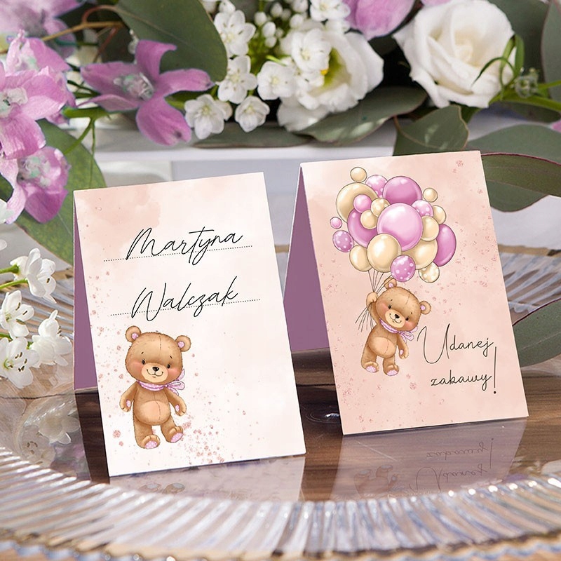Хотите предложить гостям место за столом? Используйте виньетки с возможностью самостоятельно заполнить информацию о гостях! Виньетки украшены изображением милого плюшевого мишки с воздушными шарами. Все это в розовых тонах. Это невероятно практичный продукт!