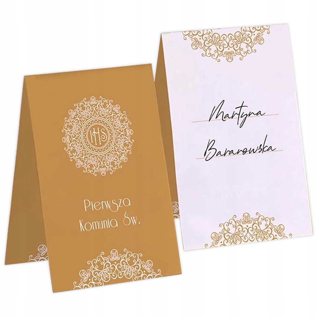 Красивые, эксклюзивные визитные карточки причастия в золотом цвете - отличный аксессуар для стола причастия!