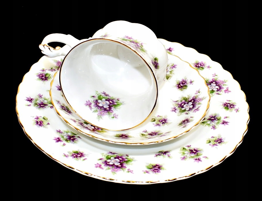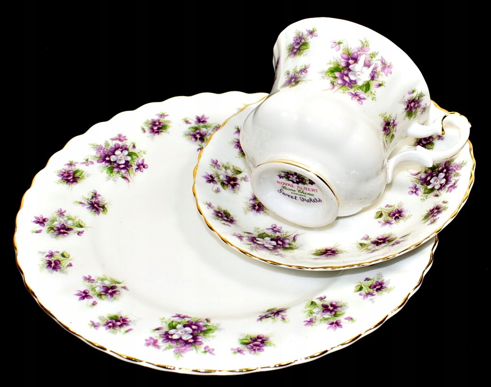 Произведен на фарфоровой фабрике Royal Albert и украшен украшением «Сладкие фиалки». Белый рифленый фарфор. Украшен букетами фиалок. Контуры красивые, изящно позолочены.