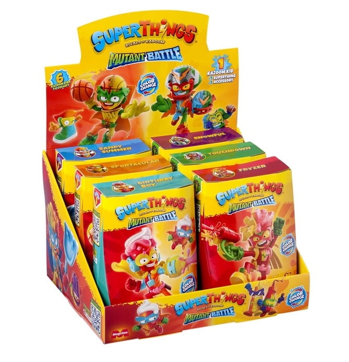 Битва Мутантов — это новая серия фигурок из мира Супер Вещей, характеризующаяся новым, совершенно иным лицом. К команде присоединились Kazoom Kids с именами, напрямую связанными с их внешностью. В каждом пакете содержится более крупный Казум Кид и его помощник поменьше.