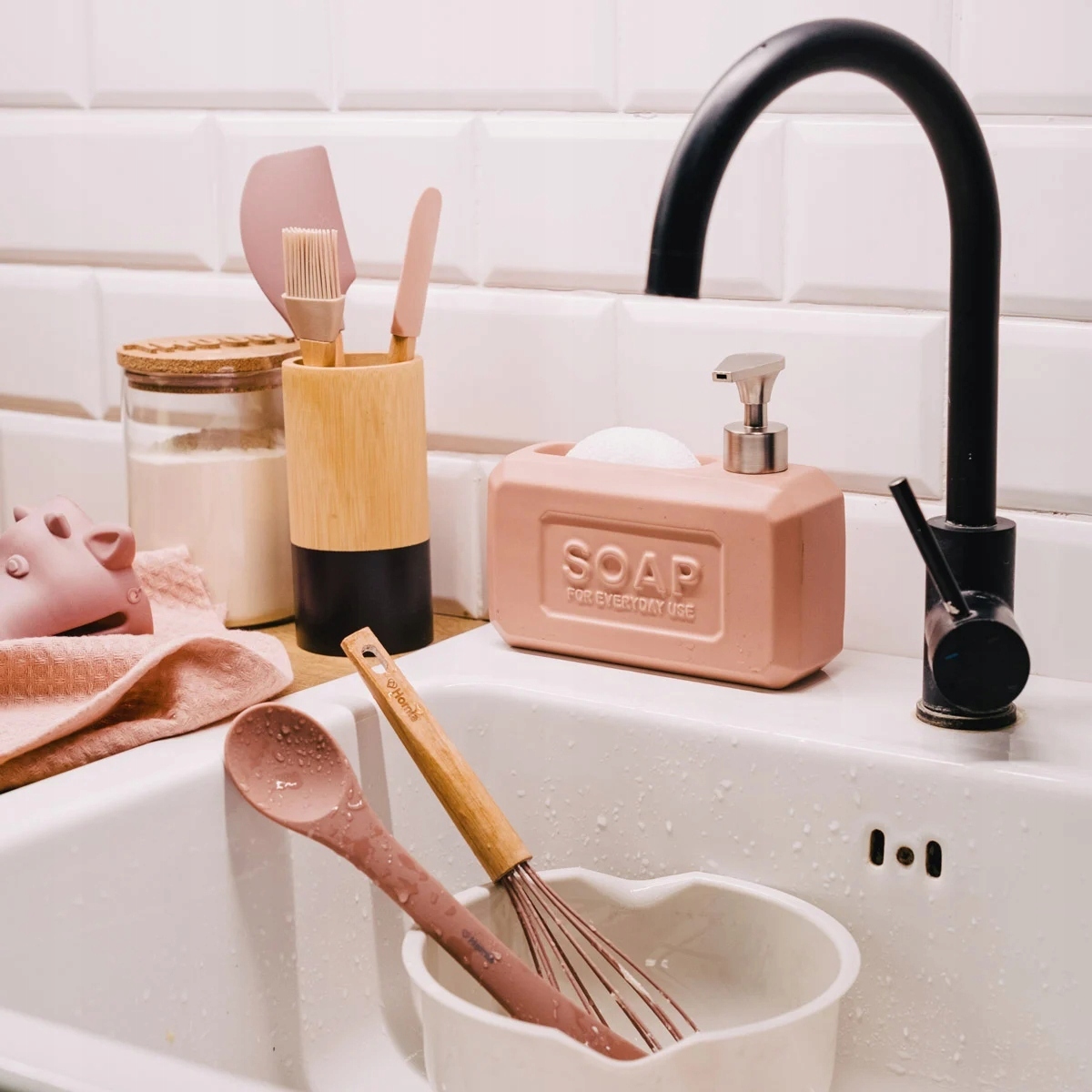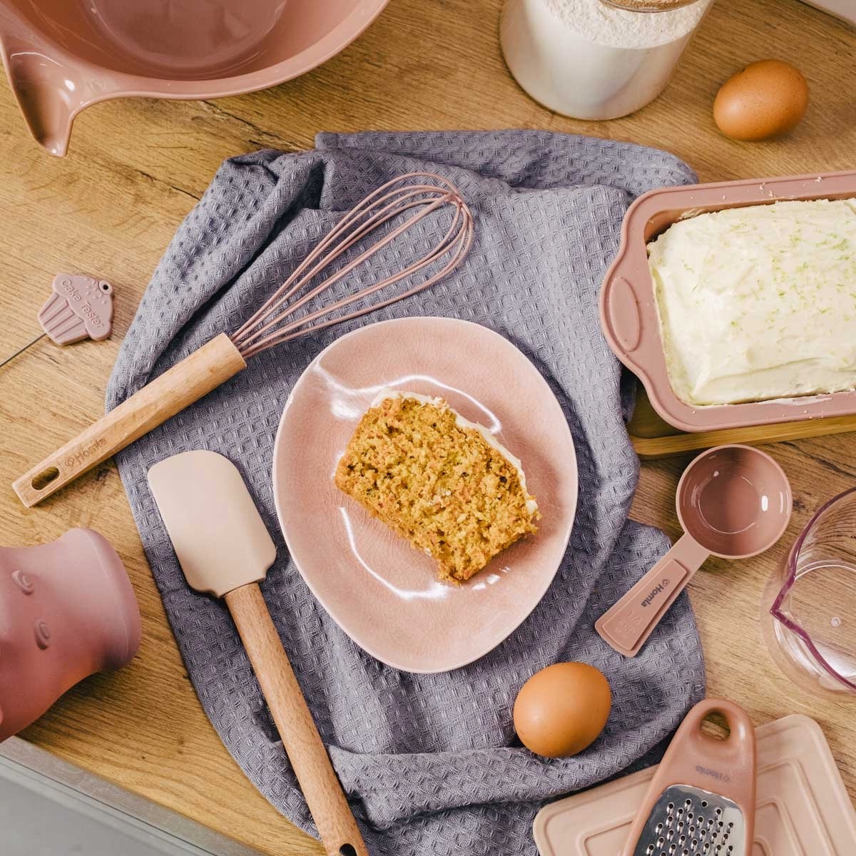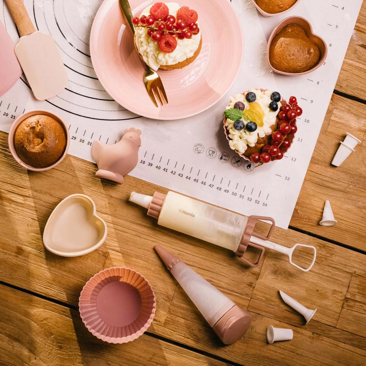 Ручки аксессуаров изготовлены из букового дерева. Однако различные советы изготовлены из силикона. Советы бывают трех разных цветов. Первая - это кремовая кисть, а еще два - спатулы в двух разных оттенках розового. Все элементы могут быть вымыты в посудомоечной машине.