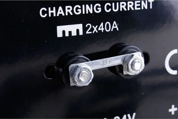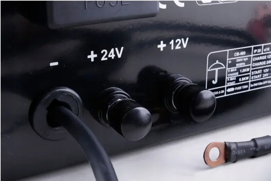 Устройство подходит для зарядки как 12В, так и 24В. Выпрямитель может заряжать как одну батарею, так и несколько. В зависимости от способа подключения мы можем заряжать несколько батарей, подключенных параллельно напряжением 12 В (или 24 В, если батареи имеют такое напряжение), или две батареи 12 В, соединенные последовательно. В этом случае подключите плюсовой кабель к выходу 24 В.