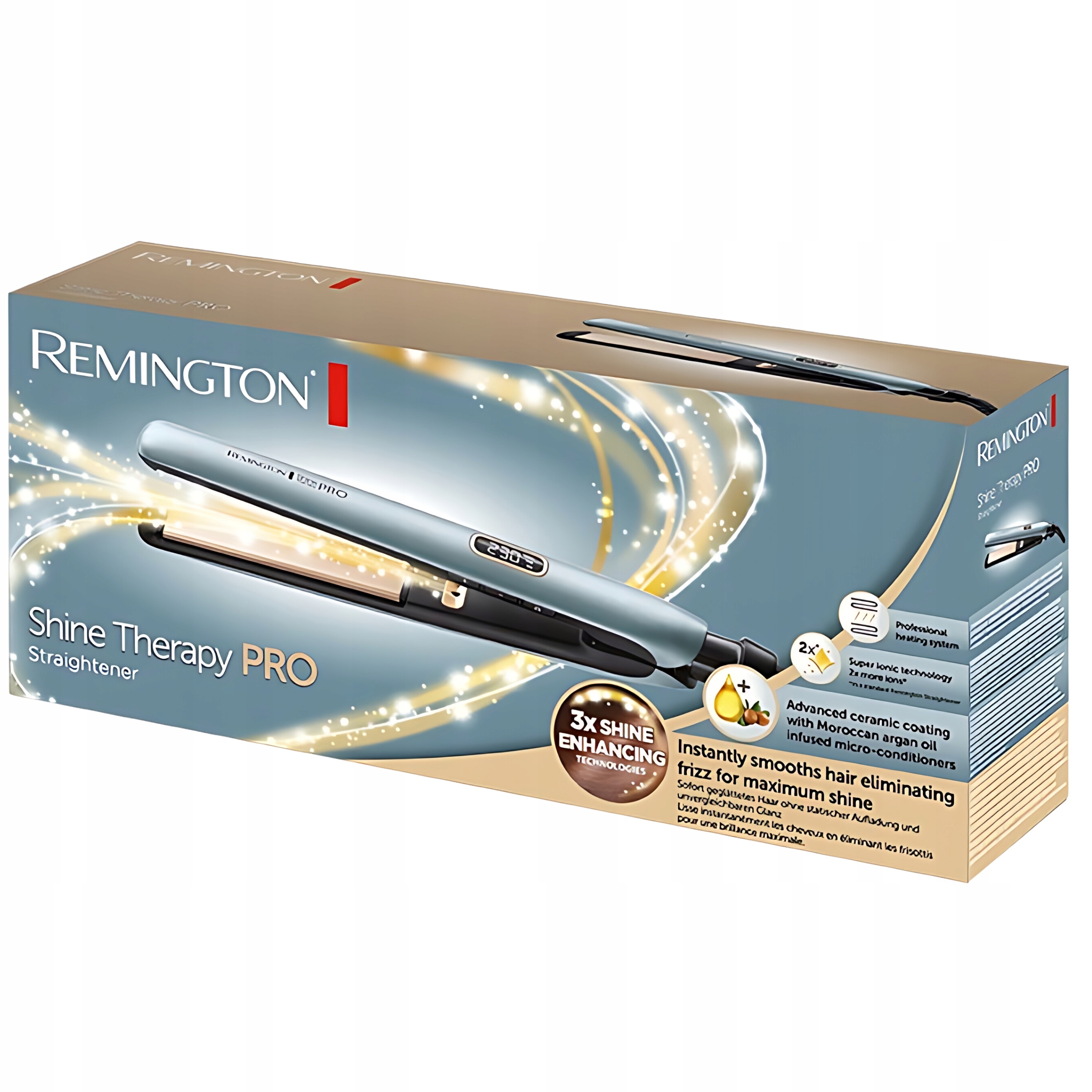 ► remington getherener Shine Therapy Pro обогащает стиля ухода, выпуская во время нагрева микро -кишечных веществ с аргановым маслом и витамином E.