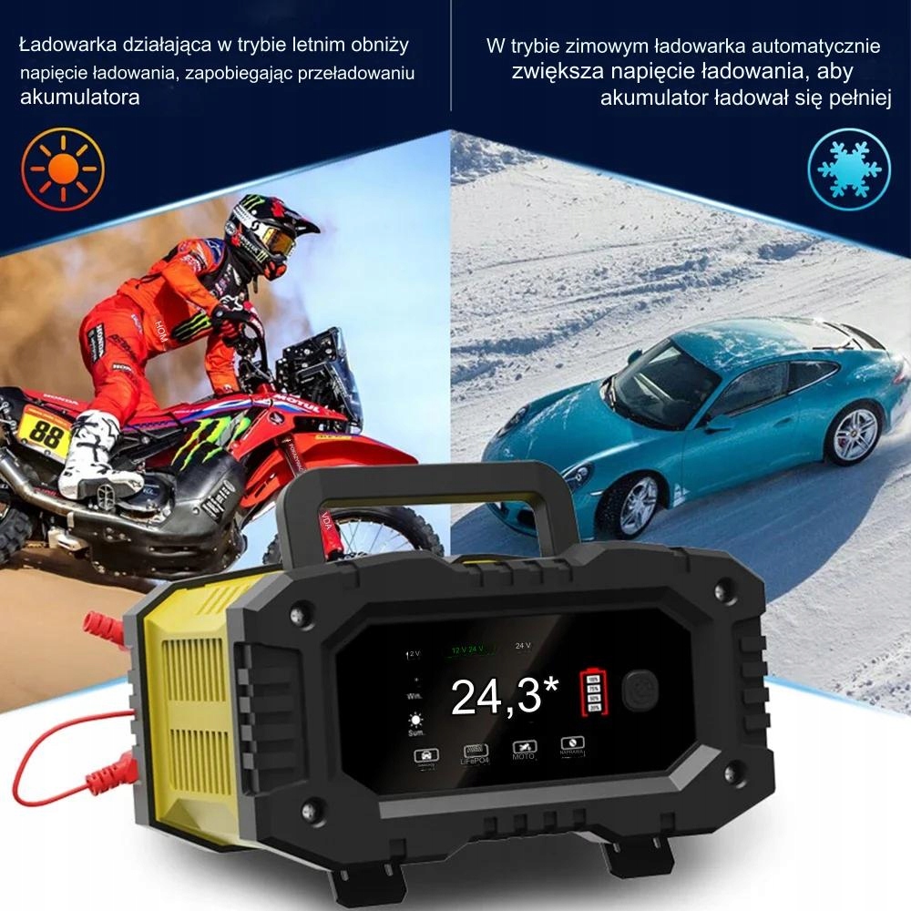 ⚡Применение Благодаря 7-ступенчатому процессу зарядки выпрямитель подходит для зарядки многих типов аккумуляторов. Это делает его идеальным для зарядки различных транспортных средств, например: легковых автомобилей, мотоциклов, внедорожников, сельскохозяйственной техники, фургонов, грузовиков и строительной техники.