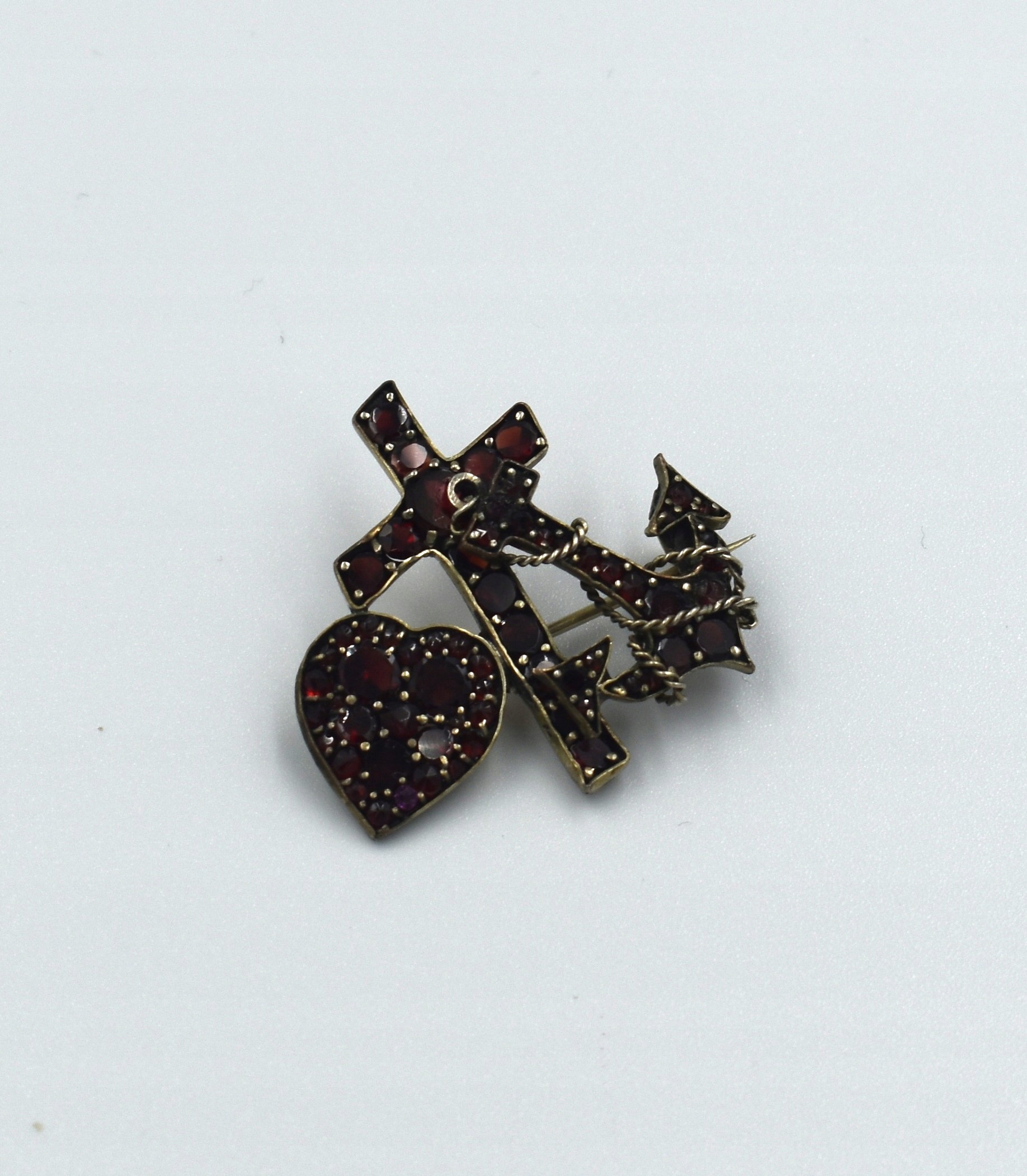 НА БРОШИ ИЗОБРАЖЕНЫ СИМВОЛЫ ЯКОРНОГО КРЕСТА И СЕРДЦА, СИМВОЛИЗИРУЮЩИЕ ВЕРУ, НАДЕЖДУ И ЛЮБОВЬ.