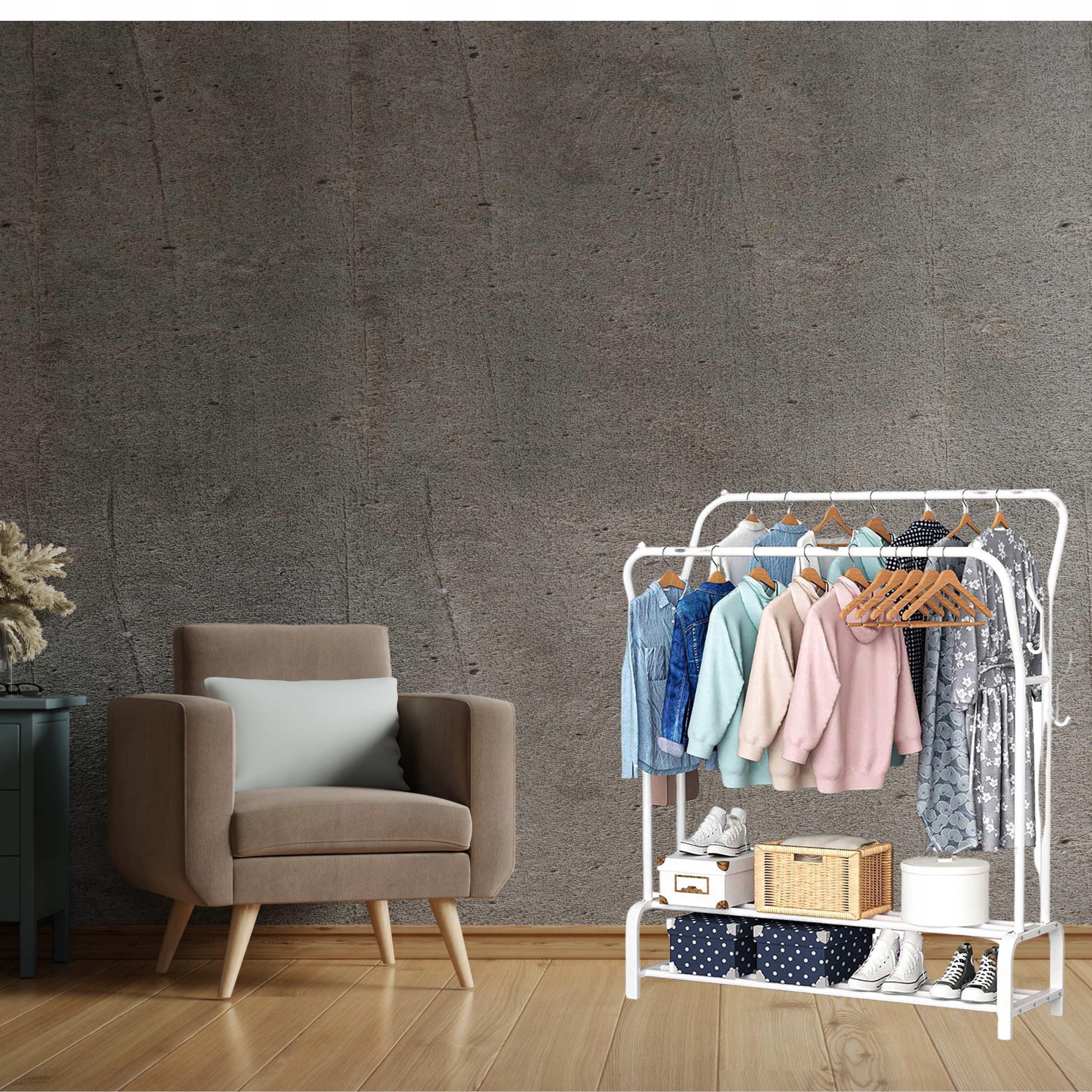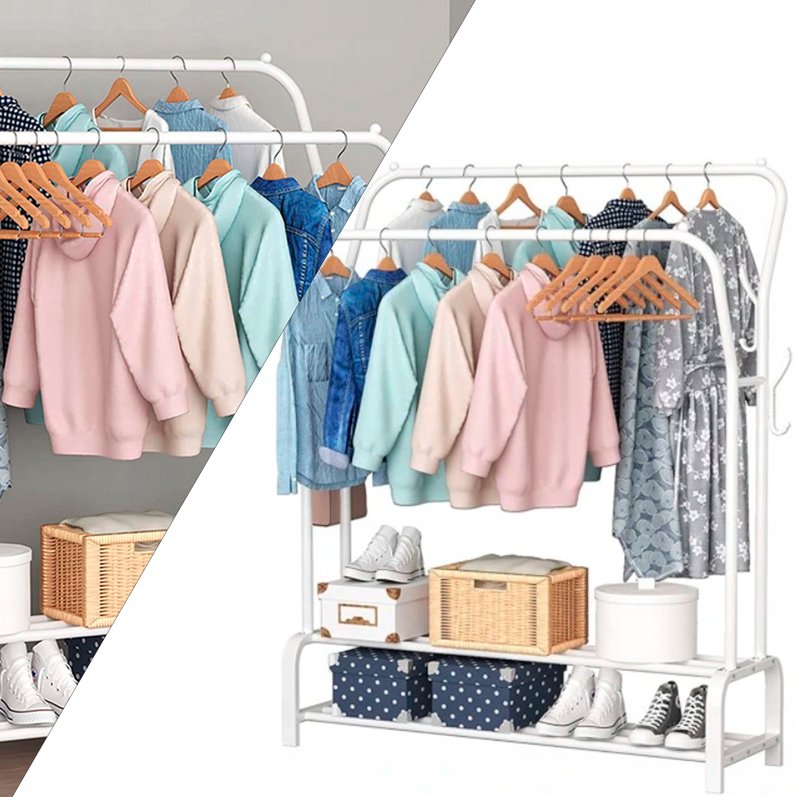 Металлическая вешалка с пространством для обуви или коробок, безусловно, будет восхищаться внешним видом и функциональностью.