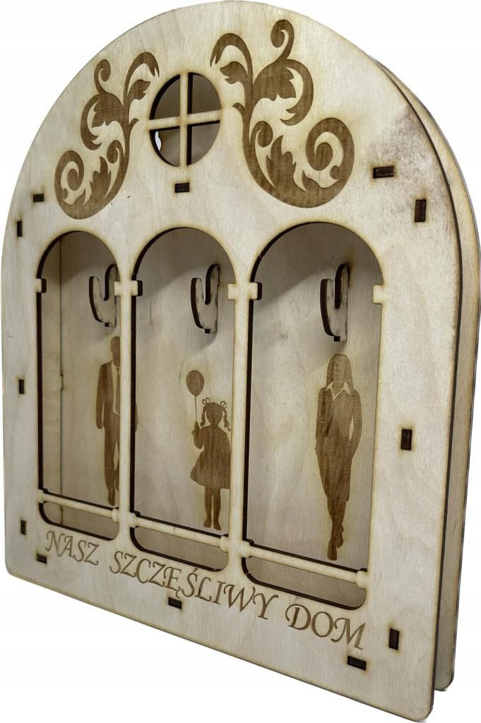 Вешалка с гравировкой, предназначенная для подвешивания на стену, имеет 3 крючка для ключей.