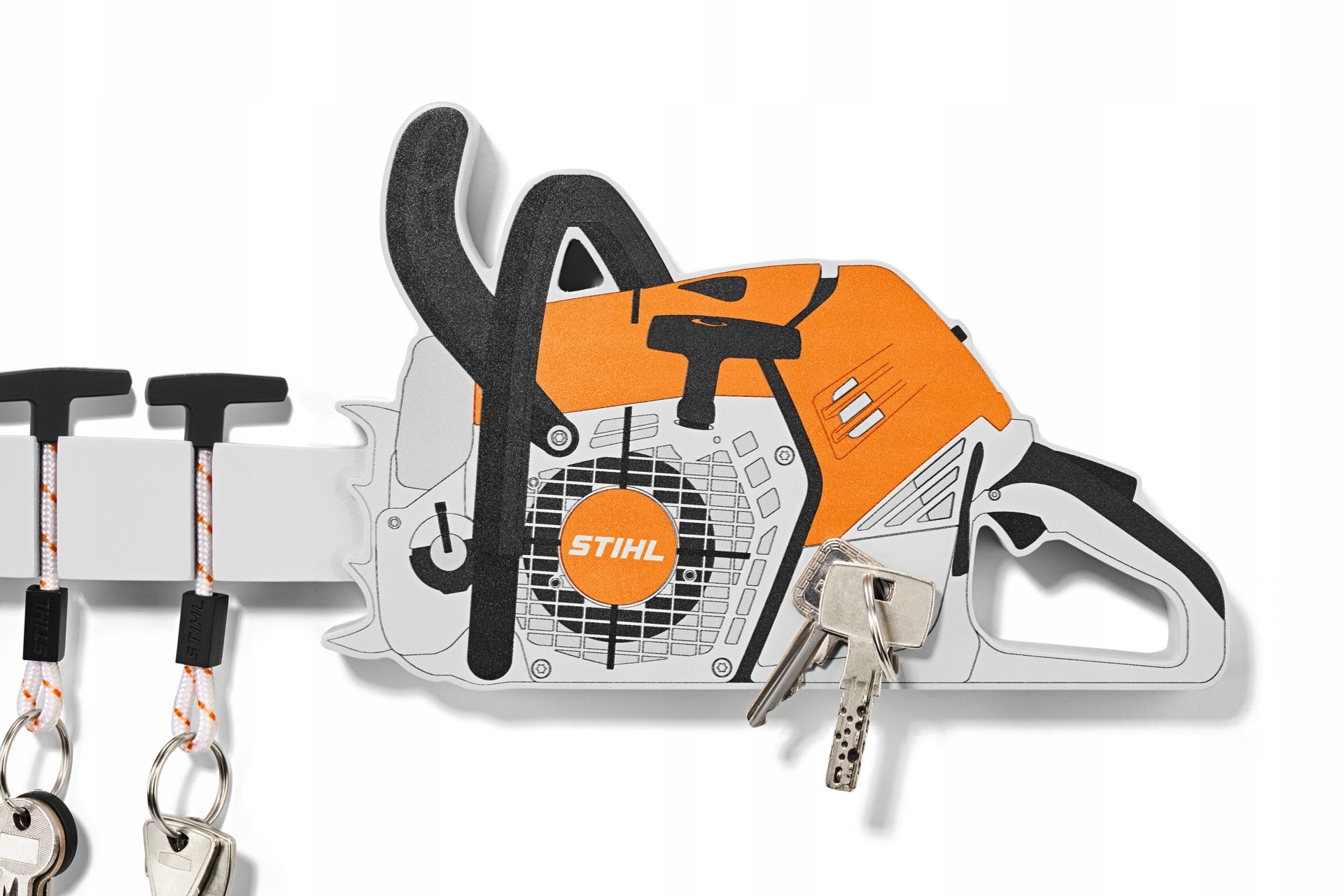 Благодаря вешалке Stihl в форме бензопилы найти ключ не составит проблем. Плита МДФ в стиле модели пилы MS 500i. Магнит, встроенный в корпус, дополнительно фиксирует ключи и другие легкие предметы и предотвращает их падение. На вешалке имеются 4 бирки для ключей в форме стартера бензопилы.